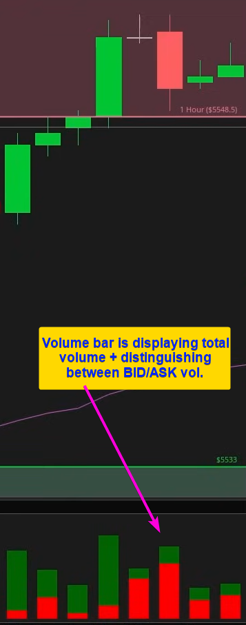 This post is about the "BIDVolume vs ASKVolume study". Please note I have set the "Show BID volume as positive" to yes. --------------- When displaying candles that are BID dominant the volume bar does not show any coloring for the ASK volume. However, when ASK is dominant it is showing majority coloring to be BID and minority to be ASK. I am using the "ASK/BID Volume difference bars" study to verify this. I want each volume bar in this study to display what % of volume was BID and what was ASK. I have attached 2 images below. Image 1 is my sierra chart, and image 2 is what i would like the study to look like. Thanks |