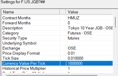 From Global Settings >> Symbol Settings, I respectfully think that you have the currency value per tick wrong. See image. Per JPX website for 10 year JGB futures: https://www.jpx.co.jp/english/derivatives/products/jgb/jgb-futures/01.html -> 0.01 yen per 100-yen face value (from website) -> Facevalue 100,000,000 yen (from website) => 100m / 100 = 1,000,000 (your current value for currency value per tick) => 1m * 0.01 = 10,000 yen currency value per tick Date Time Of Last Edit: 2024-08-11 07:12:23