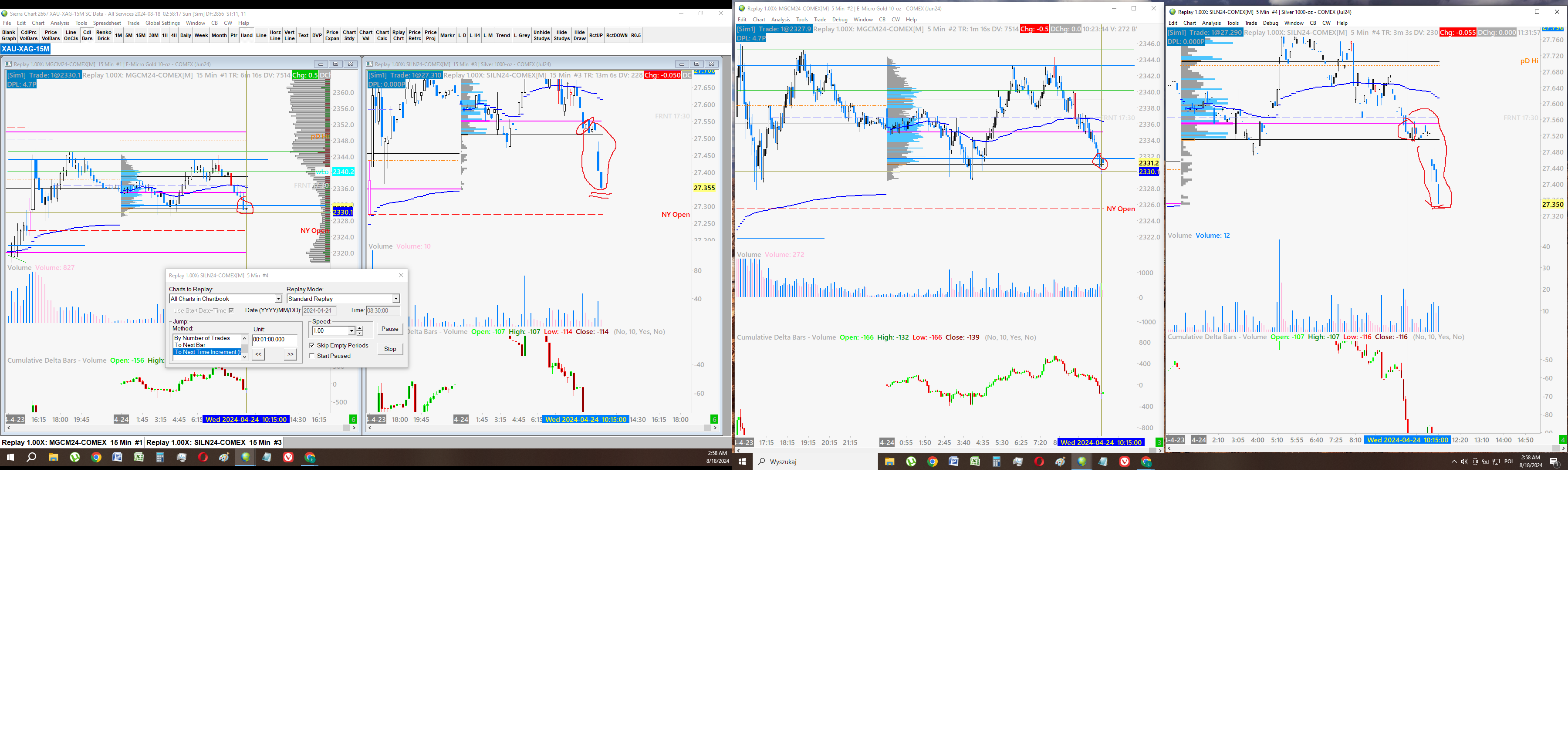 1. The VWAP from VWAP study and the VWAP from VbP study. These are being compared. 3. Two profiles , the London session and the NY session. These both have been applied a VWAP study and the VbP VWAP (thinner line) and these studies are different. Besides, the VbP VWAP have this strange ,,remnant'' of a VWAP that goes on to another profile and makes a straight line there. In this case it's dragging from London to NY and sitting there. How to get rid of that? Moreover : I'm using chart replay. Have 4 charts, 2 per symbol. IT's MGC M5/M15 and SIL M5/M15. These are old contracts (MGCM24, SILN24). I'm backtesting something in from May. These charts simply cannot be syncronised properly. I'm having ca. 10 minutes of difference between symbols. Why is this happening and what can I do about it ? Date Time Of Last Edit: 2024-08-18 19:14:30