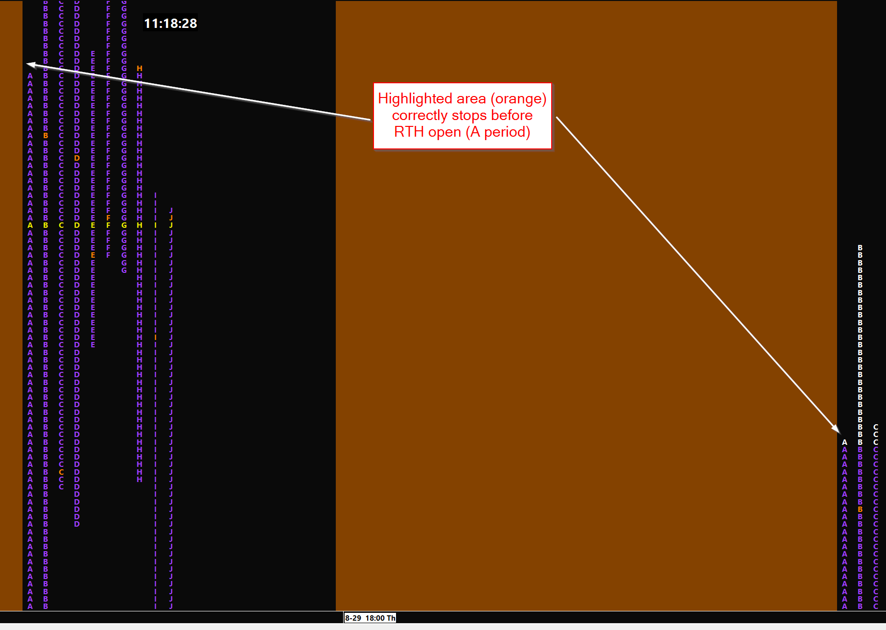 I have a TPO chart on which I want to highlight the ETH session to visually separate it from the RTH session. The desired result is shown on Screenshot 1. I did this by creating another chart with a Time Range Highlight study (which highlights the time period 18:00 - 09:29:59), and using the Study/Price Overlay study to get this study onto my TPO chart. The result almost works perfectly but there is one minor issue with it: Screenshot 2: When I open the TPO chart after 09:30, everything looks fine and as expected (I used orange in this example for better visibility): The highlighted area correctly stops on the last ETH column and before the RTH opens with column A. Screenshot 3: When I open the TPO chart at any time before 09:30, and then simply keep it open when the market opens at 09:30, the previous days are still correct (i.e., highlighted area stops before RTH open on these days), but the current day is not rendered correctly: the highlighted area for the current session does not stop before RTH open but rather continues indefinitely and eventually covers the whole day (ETH + RTH). I can fix this "rendering issue" seen in Screenshot 3 by temporarily hiding the Study/Price Overlay study and then showing it again. This "refresh" will redraw the zone correctly, and afterwards it looks as shown in Screenshot 2. However, this only seems to be a workaround to me, and it's honestly a little annoying having to do this every single day after RTH opens to fix my TPO chart. Maybe I miss something here, but I can't explain this strange behavior. Any help with this issue would greatly be appreciated. |