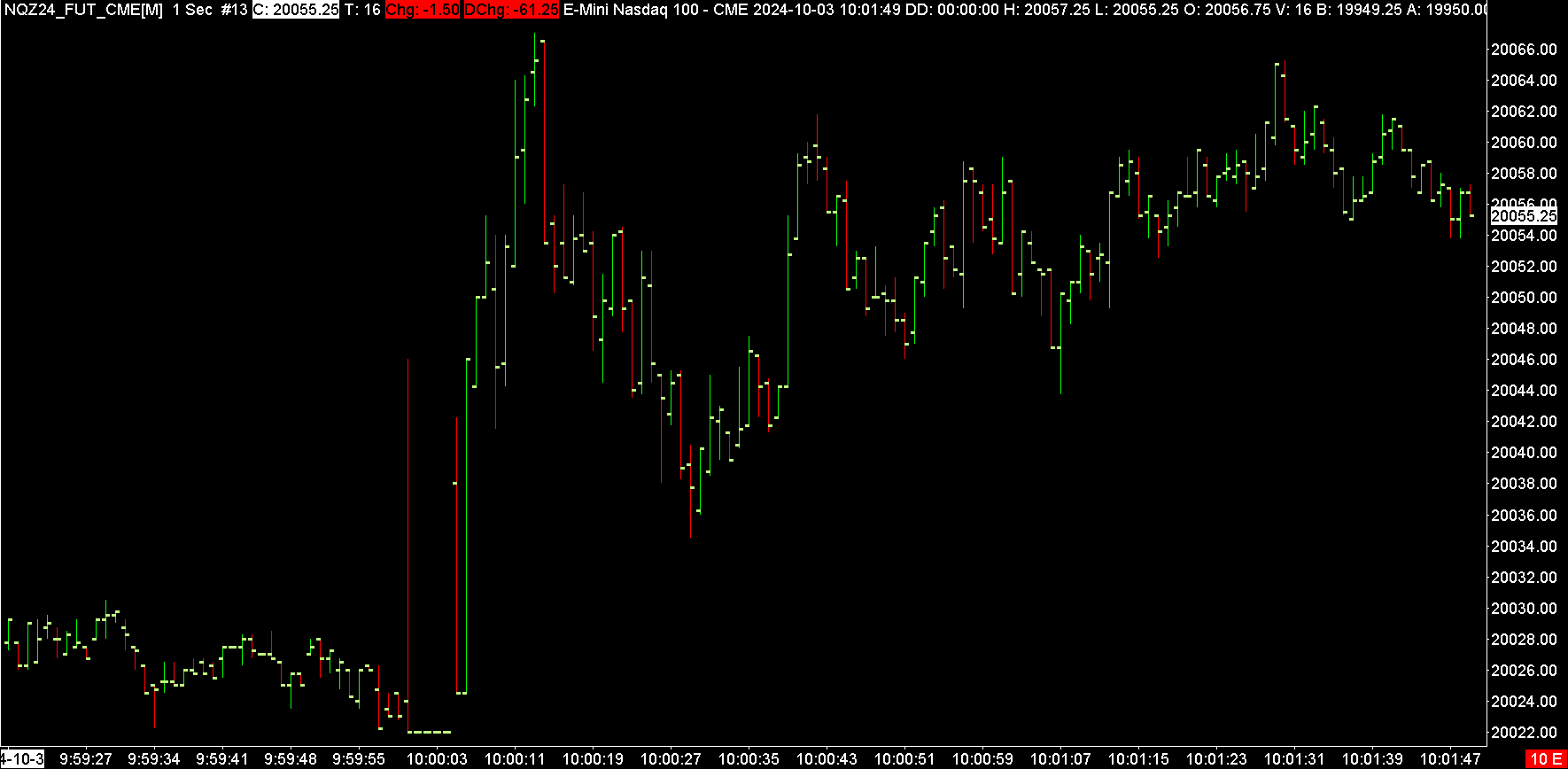 There was a trading halt at that time most likely due to a velocity logic event: https://www.sierrachart.com/image.php?Image=1727967760190.png Sierra Chart Support - Engineering Level Your definitive source for support. Other responses are from users. Try to keep your questions brief and to the point. Be aware of support policy: https://www.sierrachart.com/index.php?l=PostingInformation.php#GeneralInformation For the most reliable, advanced, and zero cost futures order routing, use the Teton service: Sierra Chart Teton Futures Order Routing |