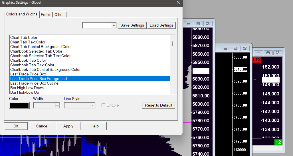 Thank you. That is already set to black, see image. But i still get white text. And i never changed that setting anyway, I only changed settings for Trade DOM. Besides, I notice that for some charts the last trade price text is black, for others it is white. Something is wrong. Both charts pictured are set to use global graphics settings, which as you can see is set to black. Date Time Of Last Edit: 2024-10-10 02:13:42