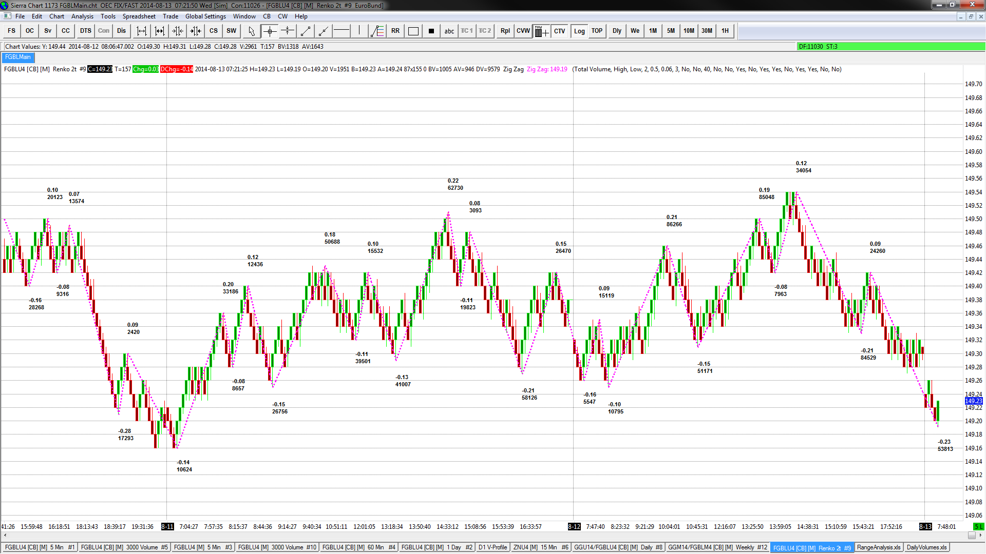 Hi, I've got the zig zag indicator set up on a renko chart. Setting the "Reset ZigZag at Start Of Trading Day" to "yes", makes the indicator disappear completely. See attached. One file shows the indicator with that setting at "no" - it shows the volumes/zigzag lines/zigzag length, and one to "yes" - shows nothing. This is the only option I am changing on this indicator. |
