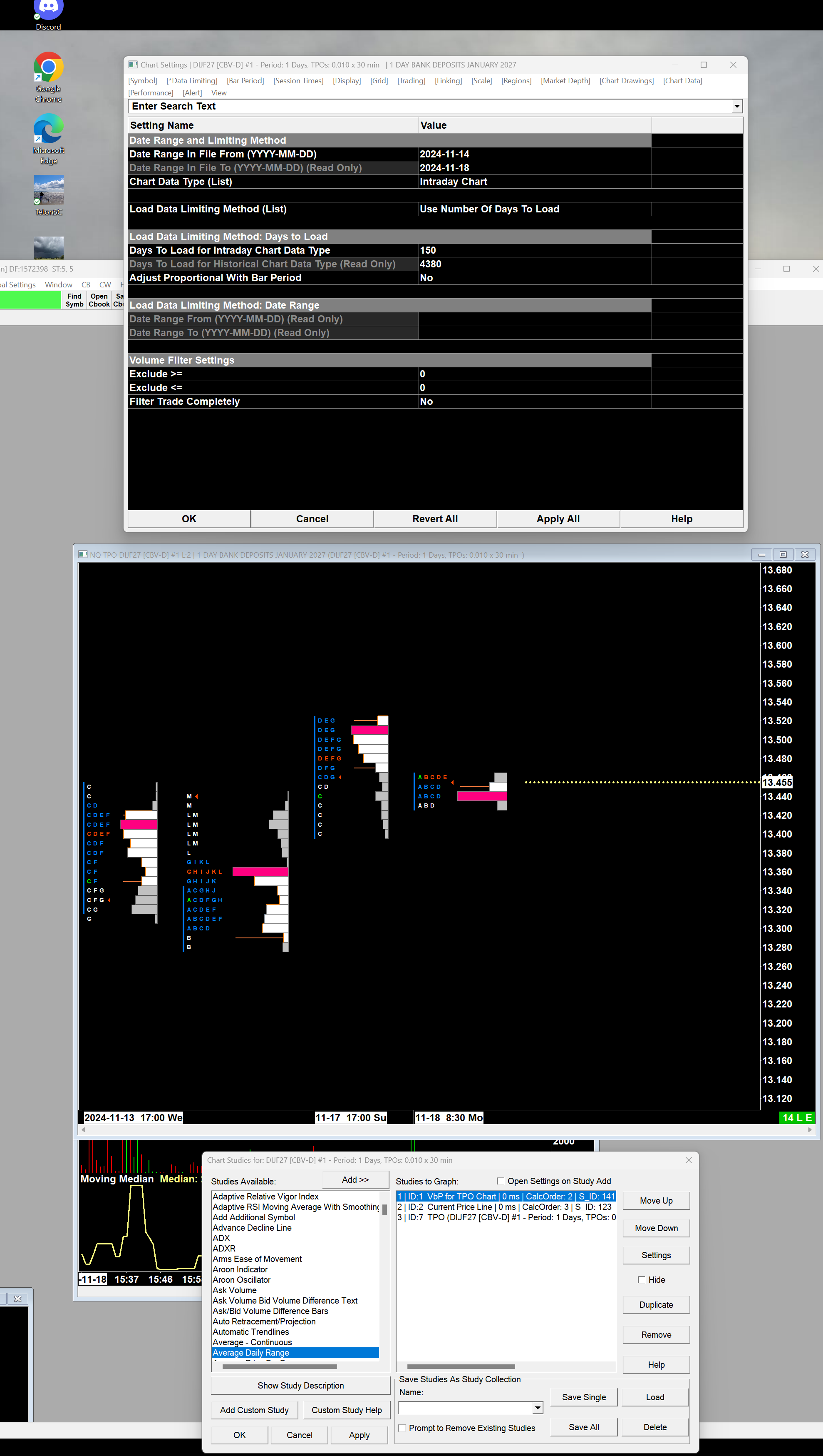 John, thank you for your reply. I have downloaded a new version of SC into my big computer that runs All Service and Teton. I just successfully connected to IQ. I created a new chartbook and a brand new chart with nothing on it. First, every chart I create with DIJ...comes up with yellow 'symbol settings not found...' see 1st attachment. The chart appears to work but this banner comes up for the first 2min. Second, I created a tpo which has 150 days but it is stuck on 4 days only, and won't obey the number of days to load. Do I have to switch on something? I am sorry I did try googling but nothing comes up. So how do I get this to give me all the days please?! Sorry to bug you, I am trying soooo hard. Karen |
