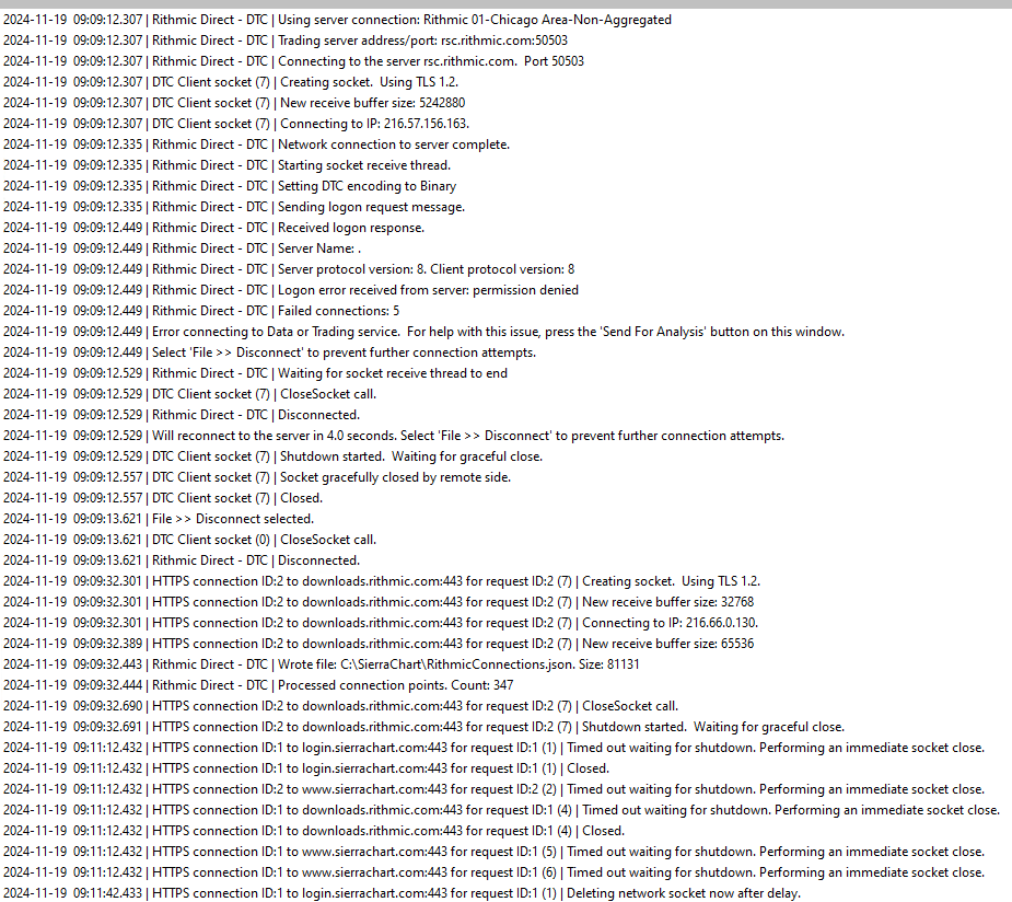 Please see attached. The error is "Connection error message from service: Rithmic Direct - DTC | Logon error received from server: permission denied | Date-Time:..." |
