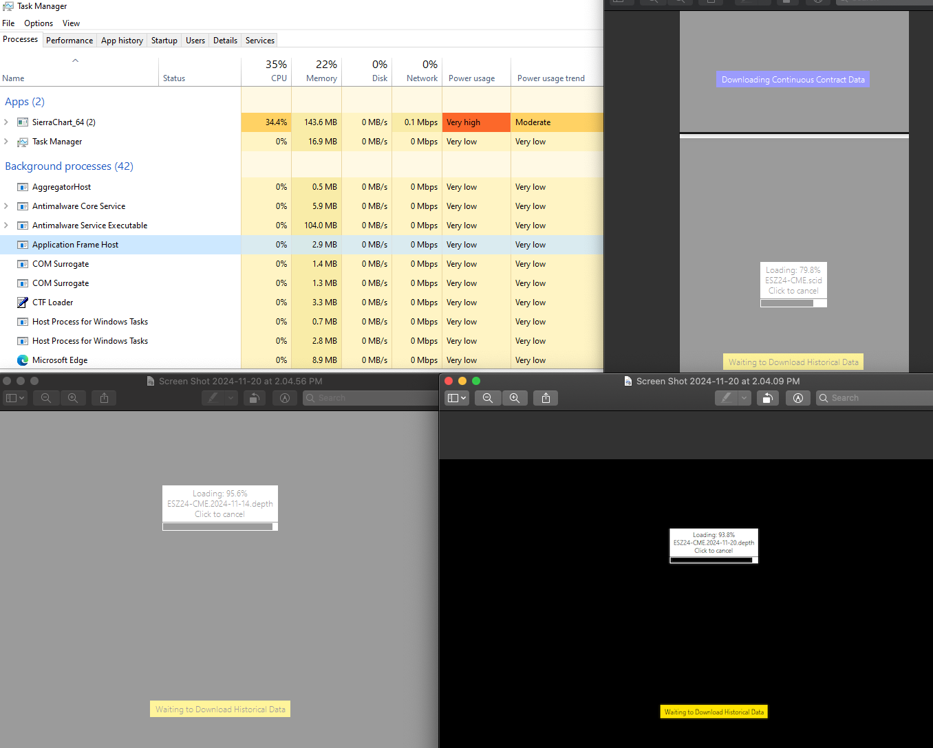 Hi John I am having related problem (i am not in replay mode; I am in Sim mode). Sierra Chart stops responding/Stalling for past 2 days . Nothing has changed. I have reduced number of studies on charts, deleted any custom studies, run in safe mode, deleted some charts, reduced days to load to mostly 7 days etc, deleted market depth study on all charts but nothing is working. I must have tried at least 2 dozen times above mentoined troubleshooting methods and also these: restarting SC, restarting windows10 Pro, shutting down machine . The needle gets stuck in loading data. Attached are windows task manager and sierra chart screens. I have no idea what to do.... Please let me know. Thank You! Sierra chart Version 2700 |