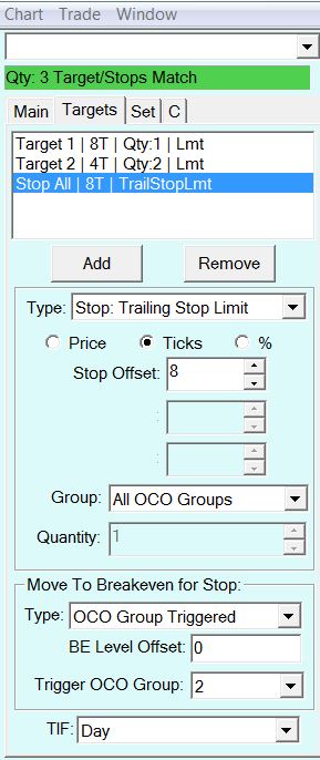 https://www.sierrachart.com/Download.php?Folder=SupportBoard&download=3154 What I am trying to do right now is to buy 3 contracts with an 8 ticks stop, sell 2 at a 4 ticks profit, and have the stop for the remaining contract go to breakeven as soon as that sell order is executed, while its sell order (the one for the third, remaining contract) stays at an 8 tick profit. Is this the correct way to do it? By putting a positive or negative number in te BE Level Offset I could do the same, but with the new stop at the specified number of ticks above or below the breakeven level, is it correct? |