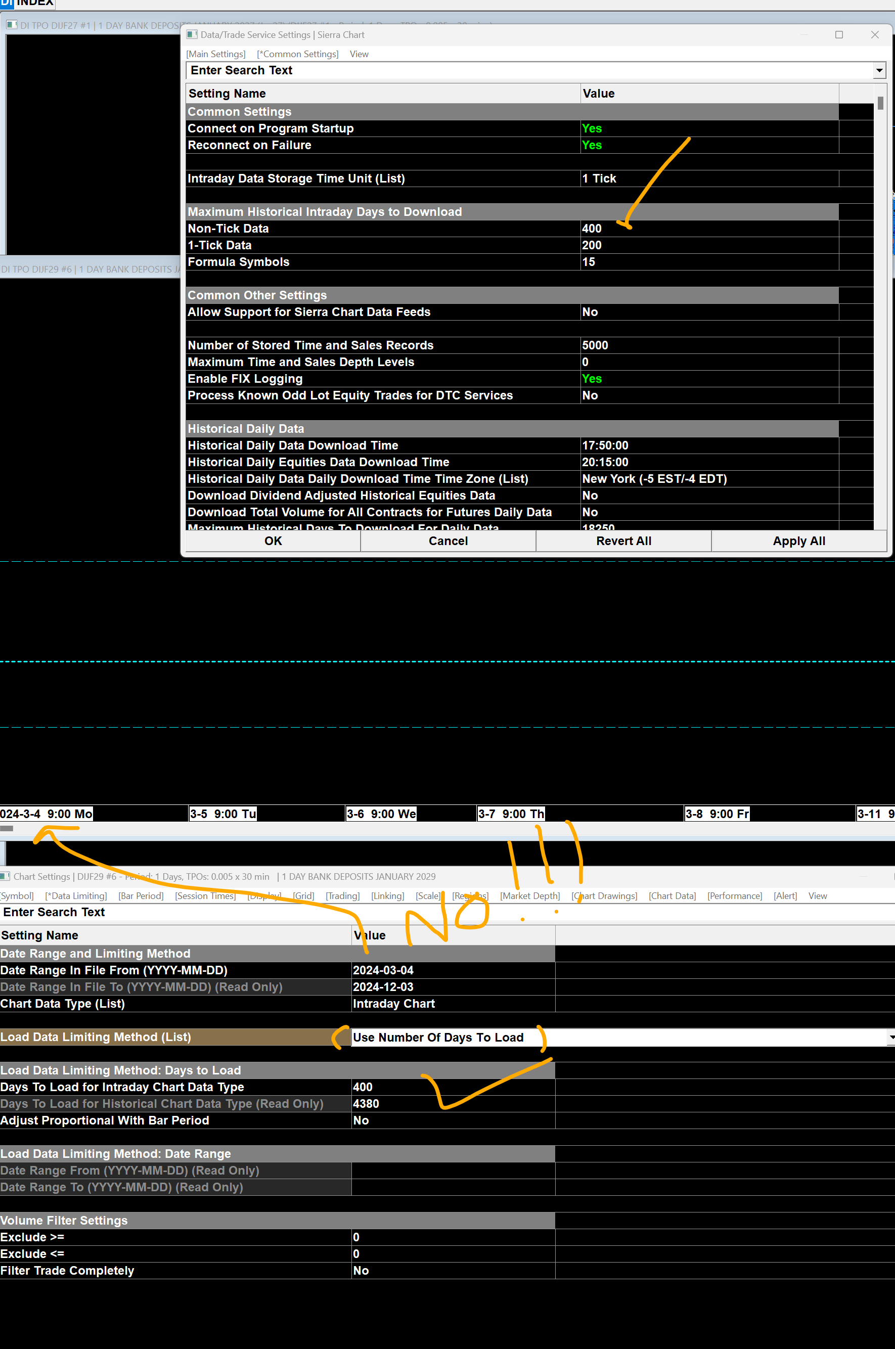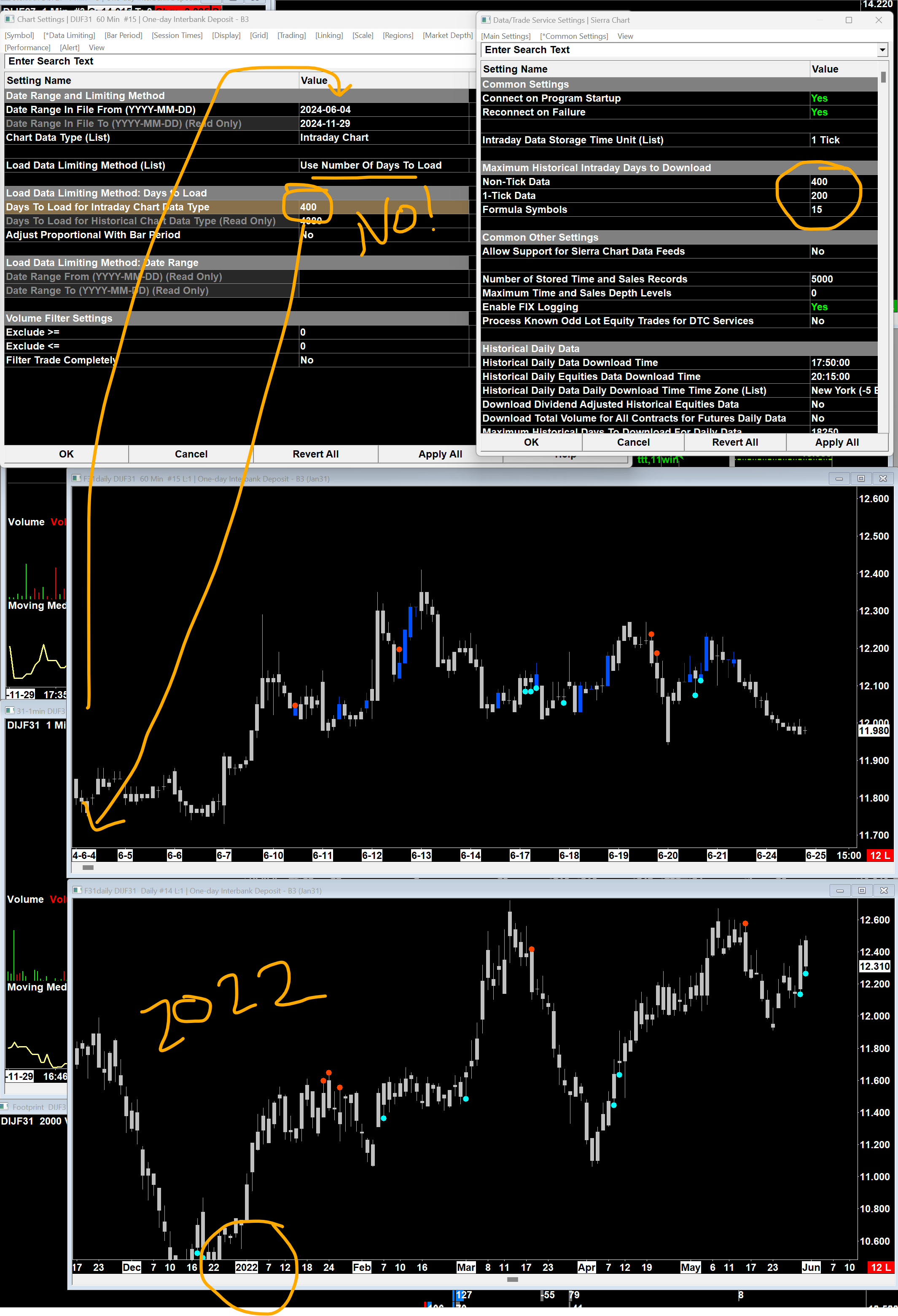 Dear SC Community, I hope someone can help as I am at my wit's end. I have a data feed with IQ data for the Brazil BMF. The data I am receiving from them clearly shows I am getting full feed. ie I can call up a basic chart on their feed and see 1-60 min bars charts 2-4 years ago. So the data is clearly coming into my PC. The issue is I cannot access this data fully using SC despite, as you will see in the screenshots, following SC rules. I can see historical data for Brazil but NOT intraday past some arbitrary date the software picks for each product. How can it be that I can see historical data going back years, but if I ask for 60min(or any min chart) it will not go back further than a few months? You see I have for the 60min chart '#of days to load' set to 400. You see in data service settings I have non-tick set to 400. I have followed the SC instructions to the letter. You can also see from my IQ chart that they are supplying 5min data going back years. So there must be some glitch that I am not getting minute data longer than some arbitrary date that SC decides. Why June 4th does it stop? I have spoken extensively with IQ, and it's obvious from the screenshot they are giving me minute data years out... I appreciate any help or suggestions, but again I have done 'days to load', I have done the data/trade service adjustment, and SC overrides my asking for 400 days to load, and gives me date in March as a start...(see last chart uploaded). Help anyone, and THANK YOU for taking the time to read this. KK |