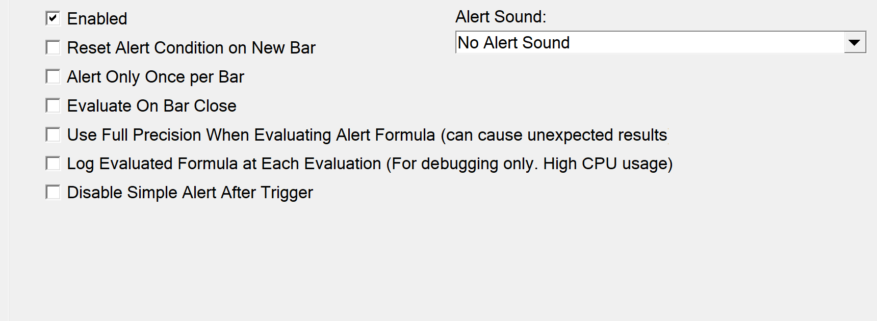 I uploaded the settings enabled for the color bar based on alert. Here is a example of the code I'm trying using text display alert for swing high and lows: =OR(SG1 > 0, SG2 > 0, SG1[-1] > 0, SG2[-1] > 0, SG1[-2] > 0, SG2[-2] > 0, SG1[-3] > 0, SG2[-3] > 0) Then I tried to use countdown timer for the text display alert dissapear at 5mins on a 15mins chart and worked good, but on the next candle keeps doing the alert when it haven't made a new swing high, low. This is the code I made: =OR(AND(ID41.SG1 > 0, ID41.SG2 > 0, ID41.SG1[-1] > 0, ID41.SG2[-1] > 0, ID41.SG1[-2] > 0, ID41.SG2[-2] > 0, ID41.SG1[-3] > 0, ID41.SG2[-3] > 0), AND(ID30.SG1 > 600)) There's a way that when it made the alert stays off until a real swing high, low have being made instead repeating the alert on each new candle John? |