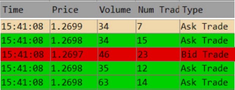 Hi I would like a way to have an audible alert to understand when in Time and Sales more trades are put in the same second but by different traders for example I would like to set it so that it has to suaanre when more than 5 trades are put in the same second but with volume >30 Num trad >1 and both bid and ask here is an example of the case I am talking about in the picture, how can I do it?
