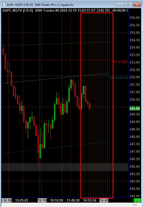 Hello, If you look at the attached 5000 Tick on AAPL and I'm using an hourly grid and the forward part of chart looks terrible. Now I wish I could set the "Forward Projection Area" to 1 but the min default is 10. Is there anyway I can create a study to hide or mask that portion of the chart so it's clean black on right. |