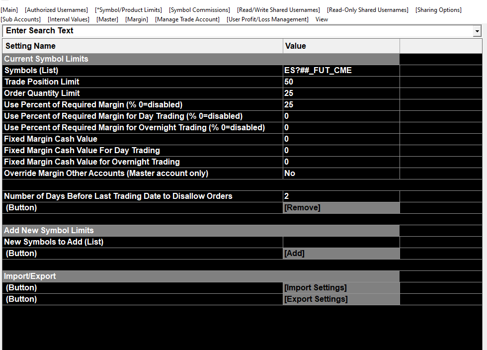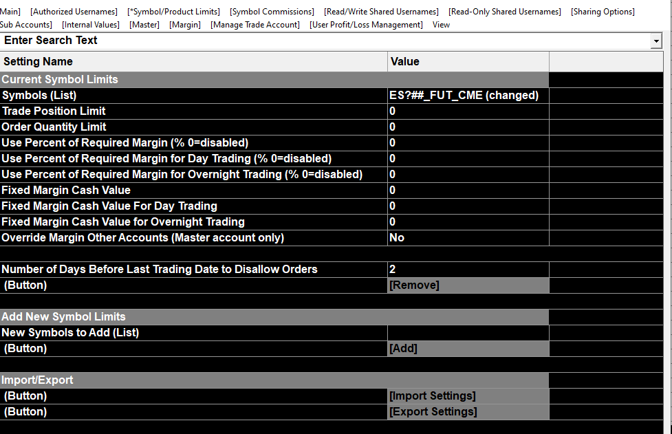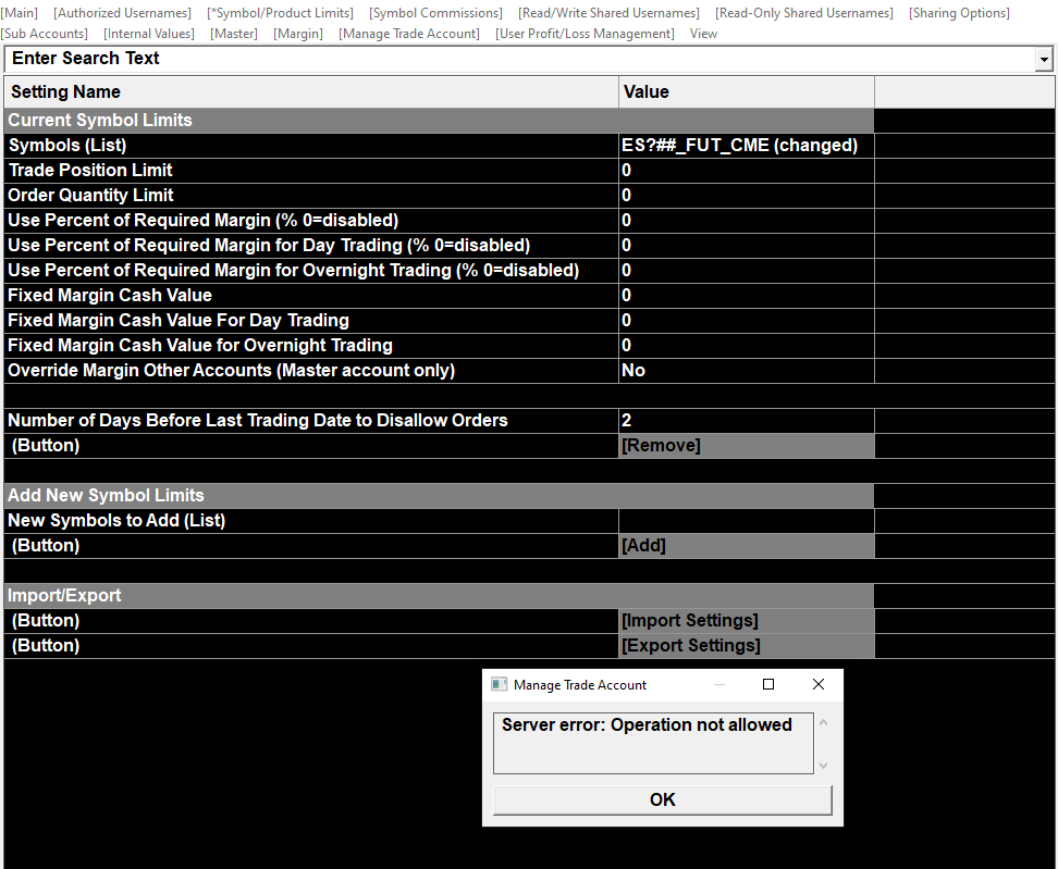 Is it possible to prevent any orders from being placed/filled by symbol? I use a DOM of ES but trade the MES contracts, could you help me find the settings to reject any orders for ES in the case I accidently click on the DOM I do not want to open a position or working order. I have already tried "edit trade account" and "symbol/product limits" on ES but I do not think it is saved properly because when I open that window back up to check it does not show 0 quantity for positions/orders. I attached three screenshots... I make the changes, select update which says successful, when I press commit you can see in screenshot two it says "operation not allowed"... in the third screenshot is when I reopen the window to see if my changes are saved. Thank you for your time, if you could help me with this I would really appreciate it! |