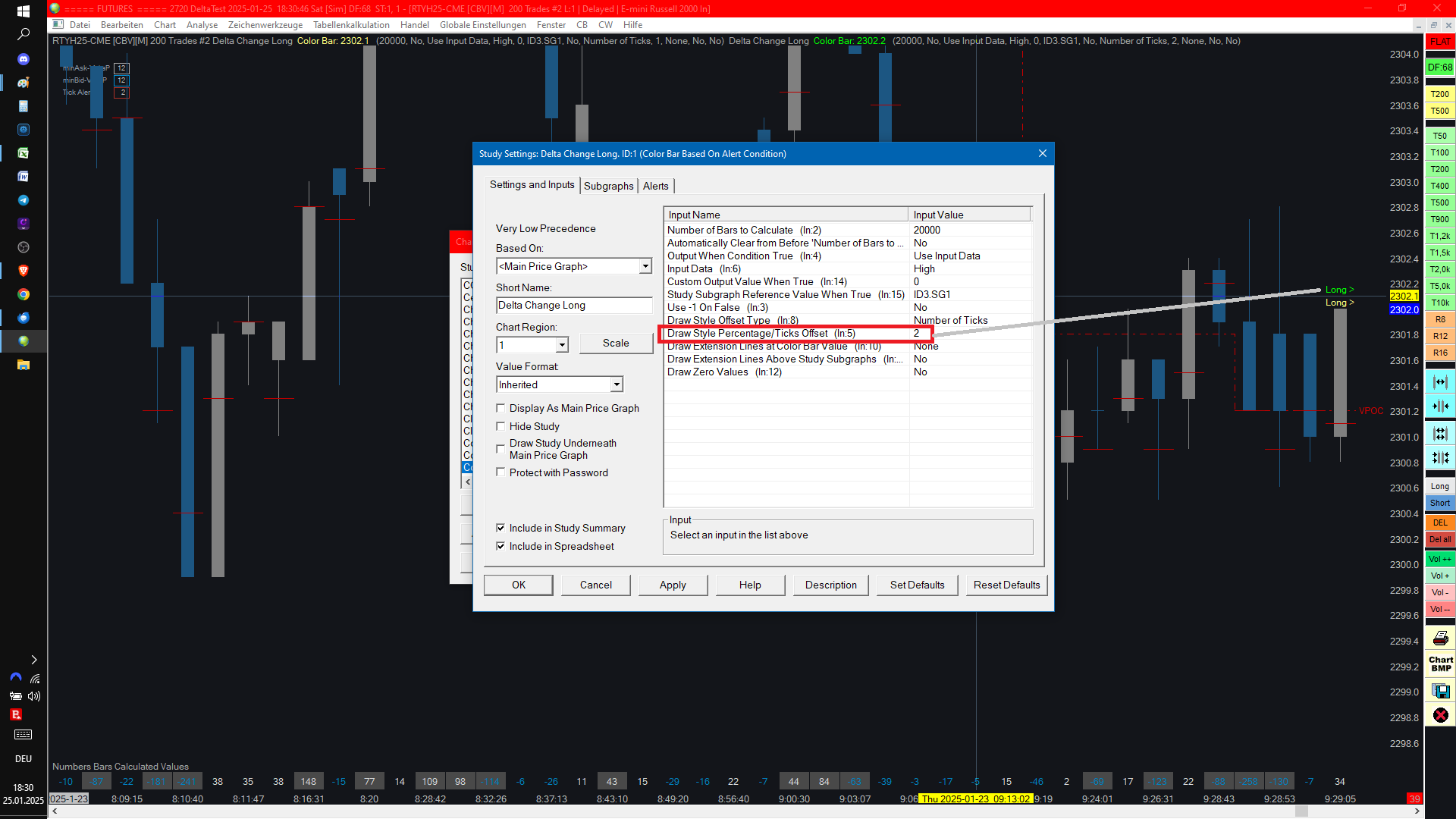 Strange, now the texts are above the high. BUT it is still not correct. pic 3: here it is set: Draw Style Ticks Offset = 1 But the text is exactly on the high and not 1 tick above it. I have switched on the crosshairs so that you can see the price on the right pic 4: Here I have set Tick Offset = 2, but it is only 1 tick above the high. The price on the right also shows it. What is the problem here? Here is the chart book for you to check. Date Time Of Last Edit: 2025-01-25 17:46:32