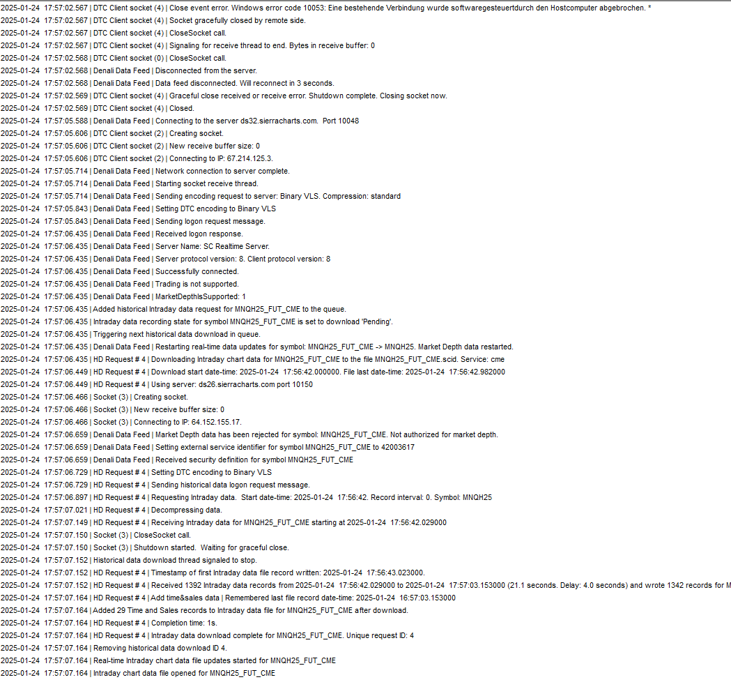 Dear all, recently, the data feed has occasionally been interrupted for no apparent reason. For clarification, I have added the message log of such an incident to the attachment. How can these interruptions be avoided? Thank you in advance for your help! |