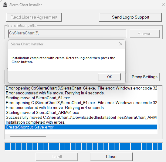 I cannot install new version. Message I get is error opening c:\SierraChart 3\SierraChart_64.exe. File error. Windows error code 32. Error encountered with file move
