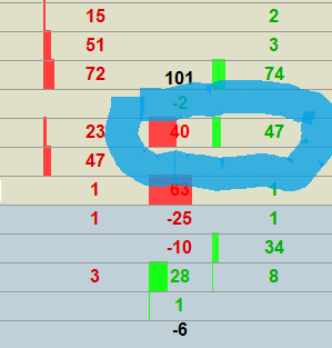 The attached pic shows "recent bid" on left, "stacking/pulling" in the middle, "recent ask" on right. In the blue circle you see the red volume "stacking/pulling" bar at 40 larger than green volume "recent ask" bar at 47. How can we make this relative?