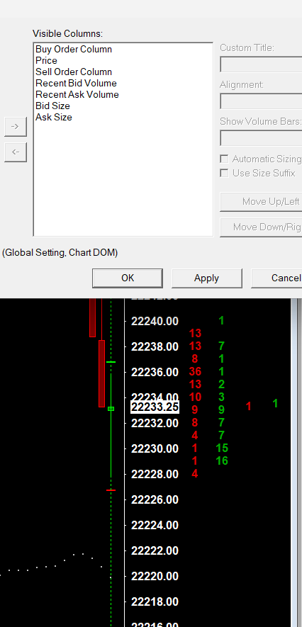 I couldn't find my prior post on this so I apologize if this is a bit redundant. I was able to add Market Depth to my chart. I want to see 10ask levels and 10bid levels of limit orders in the order book. I need to see the standing limit orders on either side that are not traded yet. I want to put them on the left and right of executed volume in the middle. Attached are the settings. How do I arrange it so the above happens? |