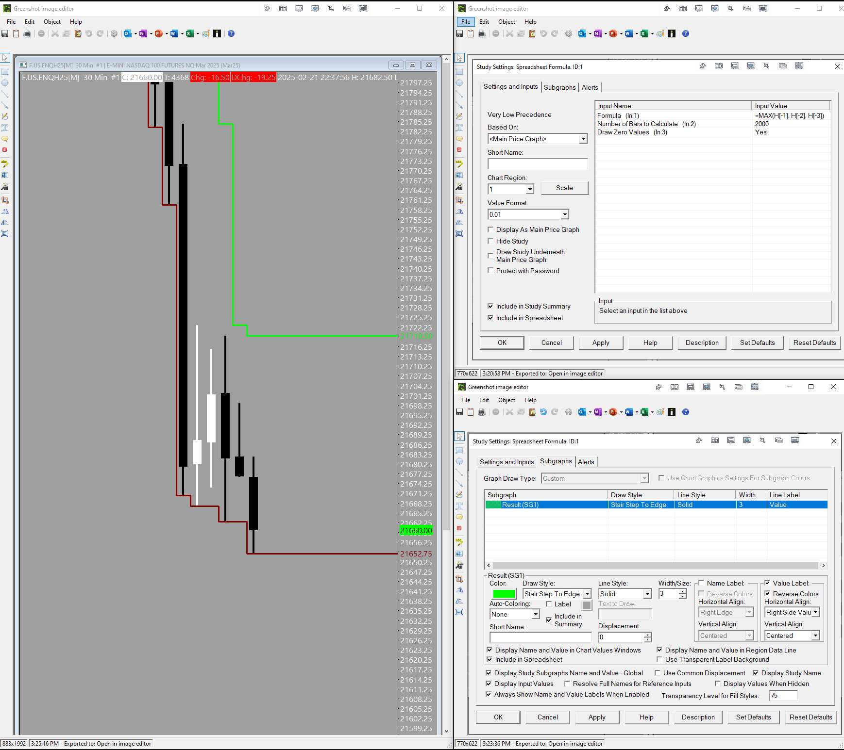 I reviewed your chartbook. The formula and settings look fine. Maybe you intended to see more historical lines. I updated your previous chartbook with 3 different settings and formulas. See which one suits your purposes best. My original example was similar to Option 3. I only needed to see the Highs and Lows for the most recent bar using horizontal lines from the left edge to the right edge. As such I only needed the last 4 bars. I anticipate that you are wanting to view more historical highs and lows and updated the lookback period to 2000 bars so that you can get historical lines on the chart. See the attached chartbook and examples and verify if any of the options is what you are looking for. Hope this is helpful. Date Time Of Last Edit: 2025-02-24 03:10:27