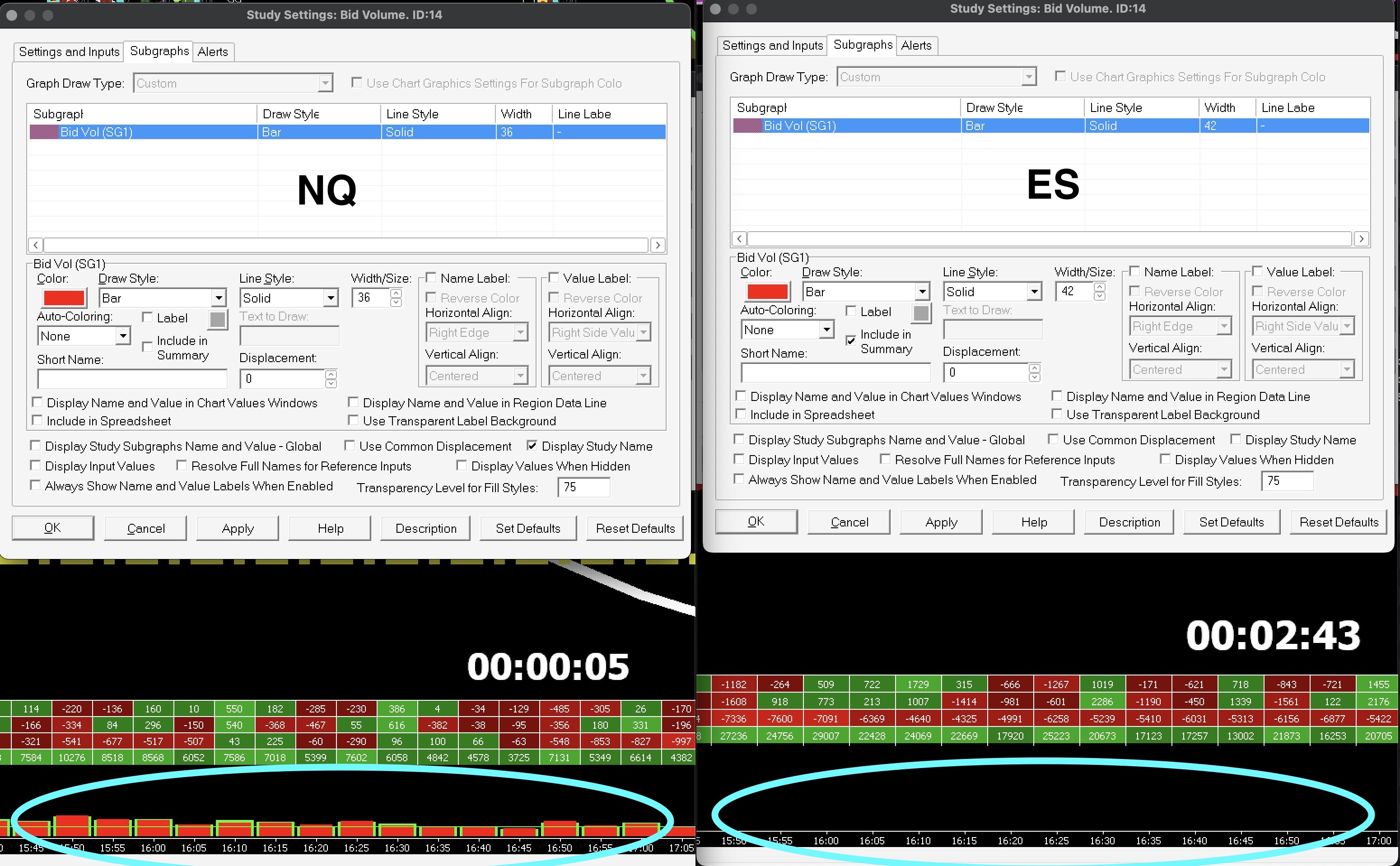 Sorry,...I was referring to the subgraphs page which has the settings! In any case, the ES and NQ chart have the same subgraphs setting but the ES data on the chart has disappeared... as you can see! If there are no inputs then I cant change anything there even if i wanted to, so the data should appear on the chart along as the bar widths are wide enough to be seen, correct? As you can see from the last screen shot, both are set in region 3. Please see jpeg attached... Thx Date Time Of Last Edit: 2025-02-27 17:22:41