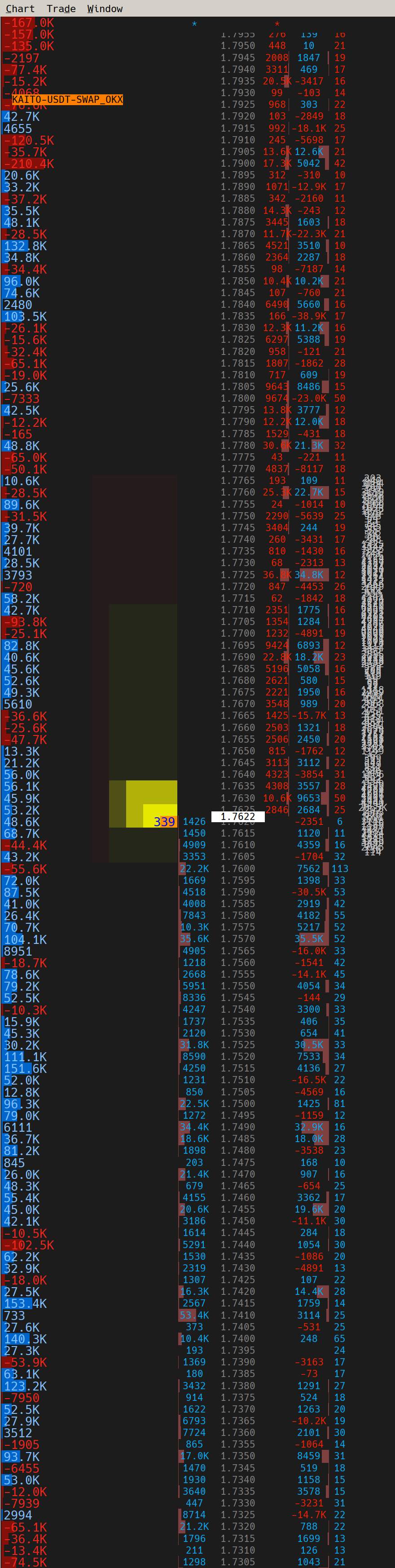 pull/stack columns also don't seem to work as expected when used as a dtc client I pre-combine the market depth data passed to the client by reading the custom data directly from file CustomSymbolSettings.dtc.xml, so my combine increment in ticks value is always set to 0 when I adjust the tick size of a symbol from large(0.0005) to small(0.0001, symbol default value), the pull/stack column does not calculate based on the new tick size, it still calculates based on the previous larger tick size(0.0005) unless I reconnect(screenshot 0.0005.jpg and 0.0001.jpg) when the tick size is not the symbol default, the numbers in the current traded total volume column are stacked together and not combined(screenshot CurrentTradedTotalVolume.jpg) |