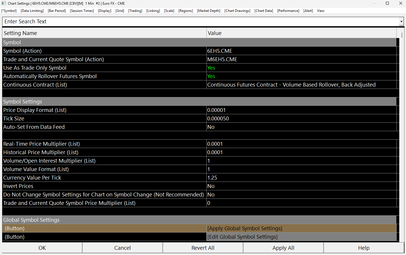 Hello, I recently wanted to try my setup on EuroFX (6E or M6E). I normally trade ES and everything is fine on this side. But the problem I have is when I try to put a sell limit order, for example at 1.09015 it actually put my limit at 10901.50 so it multiply it by a factor of 10000 (I can see my order on Rtraderpro). And I cannot take buy limit orders because it think the price is at 10000 so it automatically fill me market when I try. I tested on Ninjatrader and everything work fine so I don't think it's my data feed, and I also tried the method of "updating my symbol setting from server" and applying the "Global symbol settings" in "chart setting" but it change nothing. I noticed that when I change the "Real time price multiplier" my order change so I don't know if it's related or not. I put a screen shot of the price on Sierra chart the price on RtraderPro and my symbol settings. Thanks in advance for the help. |