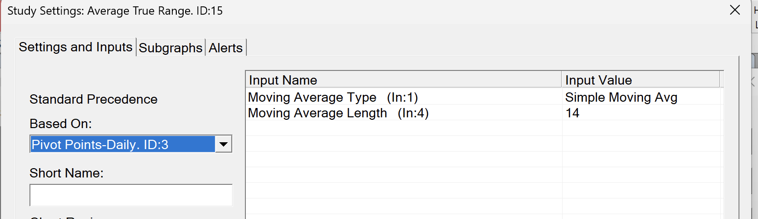 If I load the average true range study to a chart and change the standard precedence from main price on graph to pivots as I am trying to find both the average true range of the pivots per time as well as standard deviation. hat pivot is it calculating to get the ATR value as there are many. If you do the same with standard deviation it lets you choose which pivot. As I have shown in both these screen shots.