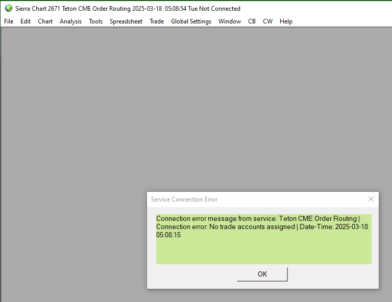 Hi, I am back from vacation. Today March 18, 2025 I activated sierra Chart. My platform does not have connection See attached notification: says Service Connection Error. Connection error message from Service Teton CME Order Routing Connection error. No trade account assigned/Date-Time 2025-03-18 5:08:15 Direct me how to fix this situation Thanks, Rajkumar Raja 240 413 7285 |