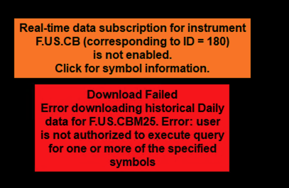 Hi Sierra Chart Support Team, I’m currently facing an issue while trying to access both real-time and historical data for several instruments, particularly from the ICE US and Bursa Malaysia exchanges through CQG connection and I am seeing the market data in QT trader of CQG. As shown in the attached screenshot, I am receiving the following error for the symbol F.U.S.CBM25: “Real-time data subscription for instrument F.U.S.CB (corresponding to ID = 180) is not enabled.” “Error downloading historical Daily data for F.U.S.CBM25. Error: user is not authorized to execute query for one or more of the specified symbols.” This issue is not limited to just this one product — I’m also experiencing similar problems across multiple futures contracts from both ICE and Bursa Malaysia. Could you please assist in solving this issue and whether it is something that needs to be done from our broker end or your end |
