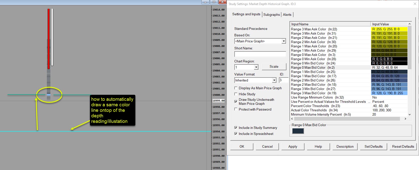 based on MARKET DEPTH HISTORICAL GRAPH study, if LN:22 (desired outcome to draw yellow horizontal line) and LN:19 (desired outcome blue horizontal line) trigger a color fulfillment in the heatmap then draw a horizontal line. would this require LN:34 and would it require a color based on alert condition alert or would this require a spreadsheet? what is simplest way to achieve this? |