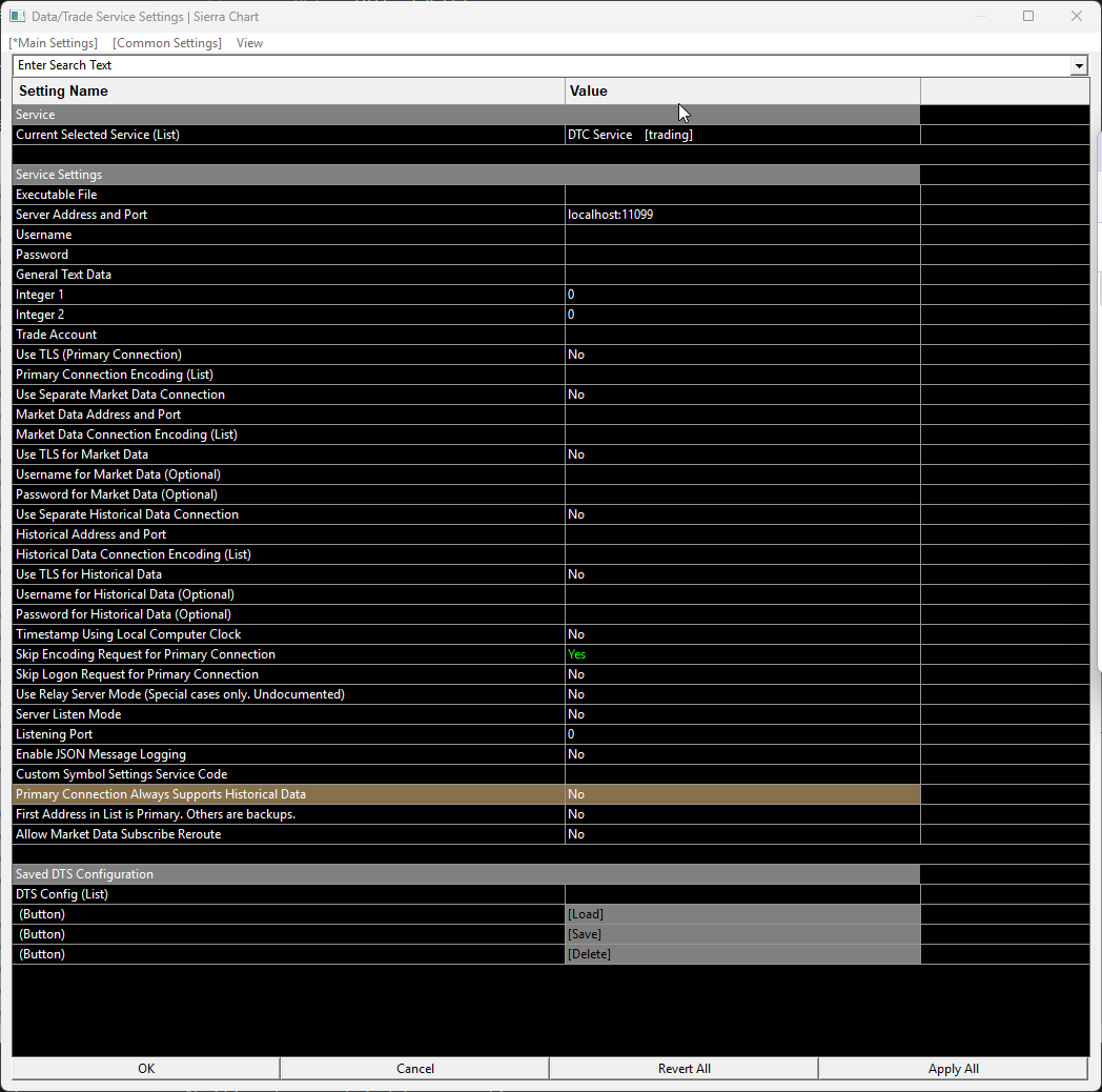 I wanted to follow up on my previous message regarding the DTC Protocol client connection issue. I think I sort of figure out the solution to the first place. I have 2 instances of sierra chart running on my desktop. 1 instance is for SC data. 2nd instance here is trying to connect to DTC Service (trading) and hopefully my software can communicate with it. However, at the moment, I cannot get my 2nd SC instance to connect. Here are the messages in SC (below). I've attached the image of the DTC Service (trading) setting. Any suggest solutions? 2025-04-16 13:34:59.298 | Software version: 2732 64-bit 2025-04-16 13:34:59.298 | Primary Thread ID: 58732 2025-04-16 13:34:59.298 | Usage end date: 2025-11-23 2025-04-16 13:34:59.298 | Enabled for: Advanced Features 2. 2025-04-16 13:34:59.298 | Enabled for: Sierra Chart Historical Data Service. 2025-04-16 13:34:59.298 | Enabled for: Denali Real-Time Exchange Data Feed. 2025-04-16 13:34:59.298 | Enabled for: Delayed Denali Exchange Data Feed. 2025-04-16 13:34:59.298 | Enabled for exchange2: CME 2025-04-16 13:34:59.298 | Enabled for exchange2: CFE 2025-04-16 13:34:59.298 | Enabled for exchange2: CBOE Global Indexes 2025-04-16 13:34:59.298 | Allow Support for Sierra Chart Data Feeds is enabled. 2025-04-16 13:34:59.298 | Current selected Data/Trading service: DTC Service 2025-04-16 13:34:59.298 | Custom symbol settings values: enabled 2025-04-16 13:34:59.298 | Chart Update Interval: 100 2025-04-16 13:34:59.298 | Intraday Data Storage Time Unit: 0 2025-04-16 13:34:59.298 | Time Zone: -04:00:00 (EST-05EDT+01,M3.2.0/02:00,M11.1.0/02:00) 2025-04-16 13:34:59.298 | 2025-04-16 17:34:59 Local computer time in UTC 2025-04-16 13:34:59.298 | 2025-04-16 13:34:59 Local computer time in SC Time Zone 2025-04-16 13:34:59.298 | 2025-04-16 17:18:51 Server time in UTC 2025-04-16 13:34:59.298 | Local computer UTC time and Server UTC time difference: 1 seconds. 2025-04-16 13:34:59.298 | Program path: C:\SierraChart\ 2025-04-16 13:34:59.298 | Data Files path: C:\SierraChart\Data\ 2025-04-16 13:34:59.298 | OS Version Number: 10.0 2025-04-16 13:34:59.298 | Locale Setting: C 2025-04-16 13:34:59.299 | DLLs: Convergent_64.dll, ETOFSv3_64.dll, gc5150_Studies_2431_64.dll, gexbot_64.dll, google_sheets_importer_64.dll, pace_of_tape_64.dll, TapeOnChart_64.dll, TOMod_64.dll, TWFX_FREE_2484_64.dll, TWFX_FREE_64.dll, TWFX_FREE_SWS_2484_64.dll, TWFX_FREE_SWS_64.dll, TWFX_FREE_ZZS_2484_64.dll, TWFX_FREE_ZZS_64.dll, UserContributedStudies_64.dll 2025-04-16 13:34:59.299 | Allowed protected custom studies: TWFX_Free 2025-04-16 13:34:59.299 | Crash reporter started: true 2025-04-16 13:34:59.299 | 2025-04-16 13:35:26.202 | File >> Reconnect selected. 2025-04-16 13:35:26.202 | DTC Client socket (0) | CloseSocket call. 2025-04-16 13:35:26.202 | DTC Service | Disconnected. 2025-04-16 13:35:26.202 | Will reconnect to the server in 2.0 seconds. Select 'File >> Disconnect' to prevent further connection attempts. 2025-04-16 13:35:28.207 | 2025-04-16 13:35:28.207 | DTC Service | Connecting to the server localhost. Port 11099 2025-04-16 13:35:28.207 | DTC Client socket (1) | Creating socket. 2025-04-16 13:35:28.207 | DTC Client socket (1) | New receive buffer size: 0 2025-04-16 13:35:28.207 | DTC Client socket (1) | Connecting to IP: 127.0.0.1. 2025-04-16 13:35:28.207 | DTC Protocol server | Incoming connection from 127.0.0.1. 2025-04-16 13:35:28.207 | DTC client #61. 127.0.0.1 (2) | Creating socket. 2025-04-16 13:35:28.207 | DTC Service | Network connection to server complete. 2025-04-16 13:35:28.207 | DTC Service | Starting socket receive thread. 2025-04-16 13:35:28.207 | DTC client #61. 127.0.0.1 (2) | New receive buffer size: 262144 2025-04-16 13:35:28.207 | DTC client #61. 127.0.0.1 (2) | Allocated send buffers: 32 of 131072 bytes. 2025-04-16 13:35:28.207 | DTC Service | Setting DTC encoding to Binary 2025-04-16 13:35:28.207 | DTC Service | Sending logon request message. 2025-04-16 13:35:28.207 | JSON data: 2025-04-16 13:35:28.207 | DTC JSON message: Missing 'Type' field. Ignoring message. * 2025-04-16 13:35:28.207 | JSON data: 2025-04-16 13:35:28.207 | DTC JSON message: Missing 'Type' field. Ignoring message. * 2025-04-16 13:35:28.207 | JSON data: | Number times message added: 137 2025-04-16 13:35:28.207 | JSON data: 2025-04-16 13:35:28.207 | DTC JSON message: Missing 'Type' field. Ignoring message. * 2025-04-16 13:35:28.207 | JSON data: | Number times message added: 101 2025-04-16 13:35:28.207 | JSON data: Sierra Chart 2025-04-16 13:35:28.207 | DTC JSON message: Missing 'Type' field. Ignoring message. * 2025-04-16 13:35:28.207 | JSON data: | Number times message added: 22 2025-04-16 13:35:32.488 | DTC client #61. 127.0.0.1 | No heartbeat received after 4s. Closing network socket. Bytes in receive buffer: 0 2025-04-16 13:35:32.488 | DTC client #61. 127.0.0.1 (2) | CloseSocket call. 2025-04-16 13:35:32.488 | DTC client #61. 127.0.0.1 (2) | Write in progress. Shutdown being delayed. PendingSize=0 2025-04-16 13:35:32.488 | DTC client #61. 127.0.0.1 (2) | Write has completed. Shutdown being performed. 2025-04-16 13:35:32.488 | DTC client #61. 127.0.0.1 (2) | Shutdown started. Waiting for graceful close. 2025-04-16 13:35:32.488 | DTC Client socket (1) | Socket gracefully closed by remote side. 2025-04-16 13:35:32.488 | DTC Client socket (1) | CloseSocket call. 2025-04-16 13:35:32.488 | DTC Client socket (1) | Signaling for receive thread to end. Bytes in receive buffer: 0 2025-04-16 13:35:32.488 | DTC Client socket (1) | Graceful close received or receive error. Shutdown complete. Closing socket now. 2025-04-16 13:35:32.488 | DTC Client socket (1) | Closed. 2025-04-16 13:35:32.488 | DTC client #61. 127.0.0.1 (2) | Socket gracefully closed by remote side. 2025-04-16 13:35:32.488 | DTC Service | Failed connections: 51 2025-04-16 13:35:32.488 | Error connecting to Data or Trading service. For help with this issue, press the 'Send For Analysis' button on this window. 2025-04-16 13:35:32.488 | Select 'File