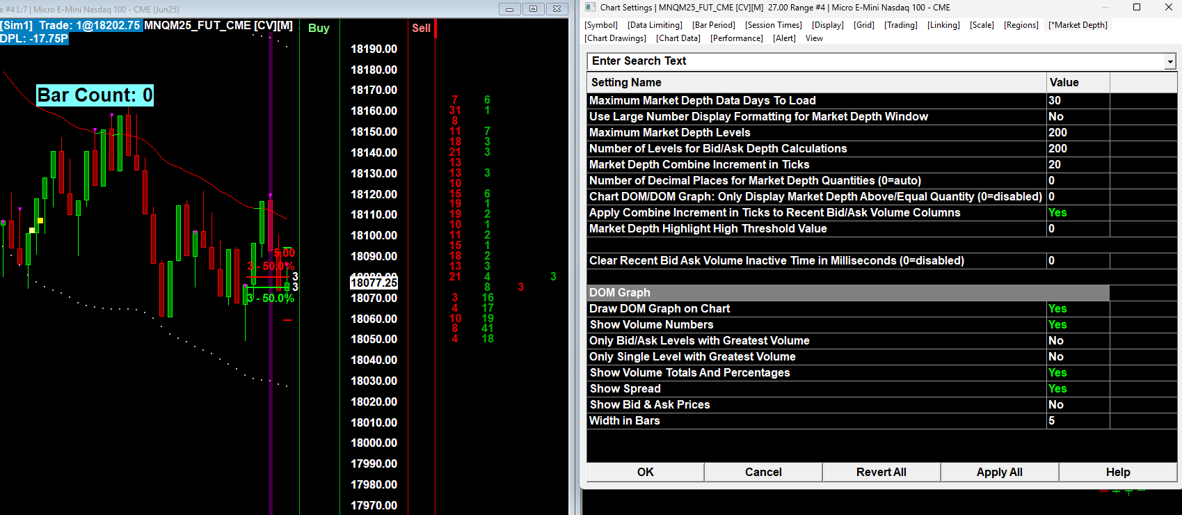 I am trying to see the depth of market for BID/ASK that run about 100pts up and 100 pts down from the current price. It is only showing the current bid/ask and then the volume transacted at bid and ask for a bunch of levels. I can't see all of the level of limit orders I want to see.