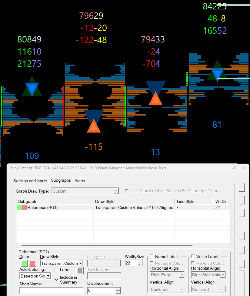 This is excellent. At the top of this candlestick are Tick-Nasdaq (the green 808) and Tick-NQ (the purple 49) The Tick-Nasdaq is using using Transparent Custom Value at Y Left Aligned The Tick-Nq is using using Transparent Custom Value at Y Right Aligned I like and use Transparent Square Offset Left/Right for Candlestick and the squares are aligned to the far left and far right and are easily distinguished. Can you please create Transparent Custom Value at Y Left/Right for Candlestick? I am looking for a way to put some space between these 2 values on the top of each candlestick. Making the font smaller does not increase the space between. Thank you in advance! Date Time Of Last Edit: 2025-05-05 01:32:46