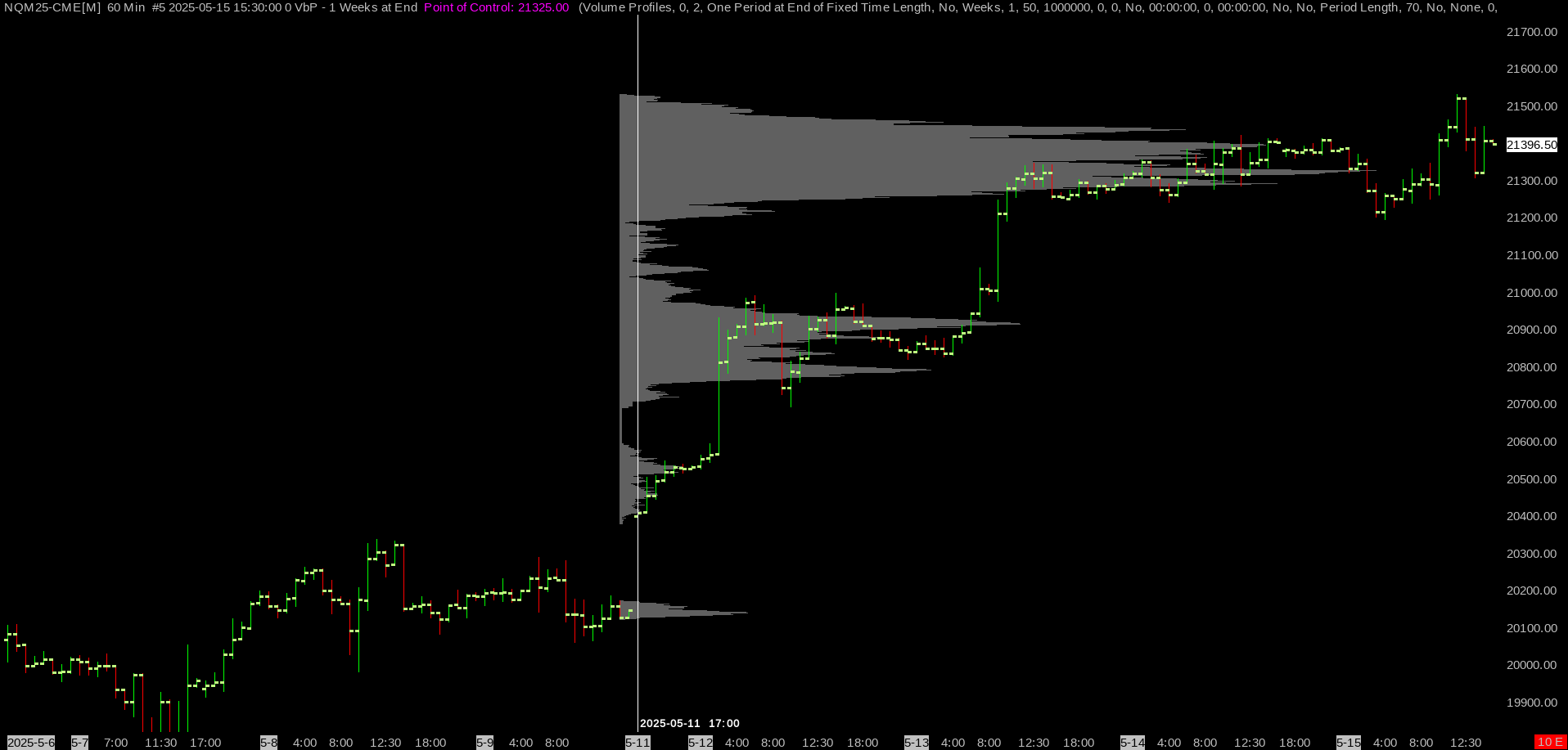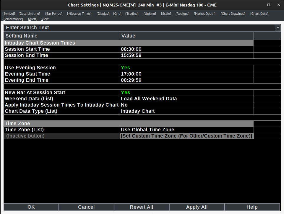 My attached 240min chart looks exactly like the screenshot you have shown me. I am on a 240min chart like yours, and I have changed my time zone settings through Global Settings >> Time Zone Settings, and set it to Chicago to match your image. I have also included a screenshot of my Chart Settings >> Session Times settings for clarity. So far this is as expected, but when I go lower than a 240min chart, the volume profile partially includes the previous week's data. 60min https://www.sierrachart.com/image.php?Image=174742105212.png 5min https://www.sierrachart.com/image.php?Image=1747421088112.png |