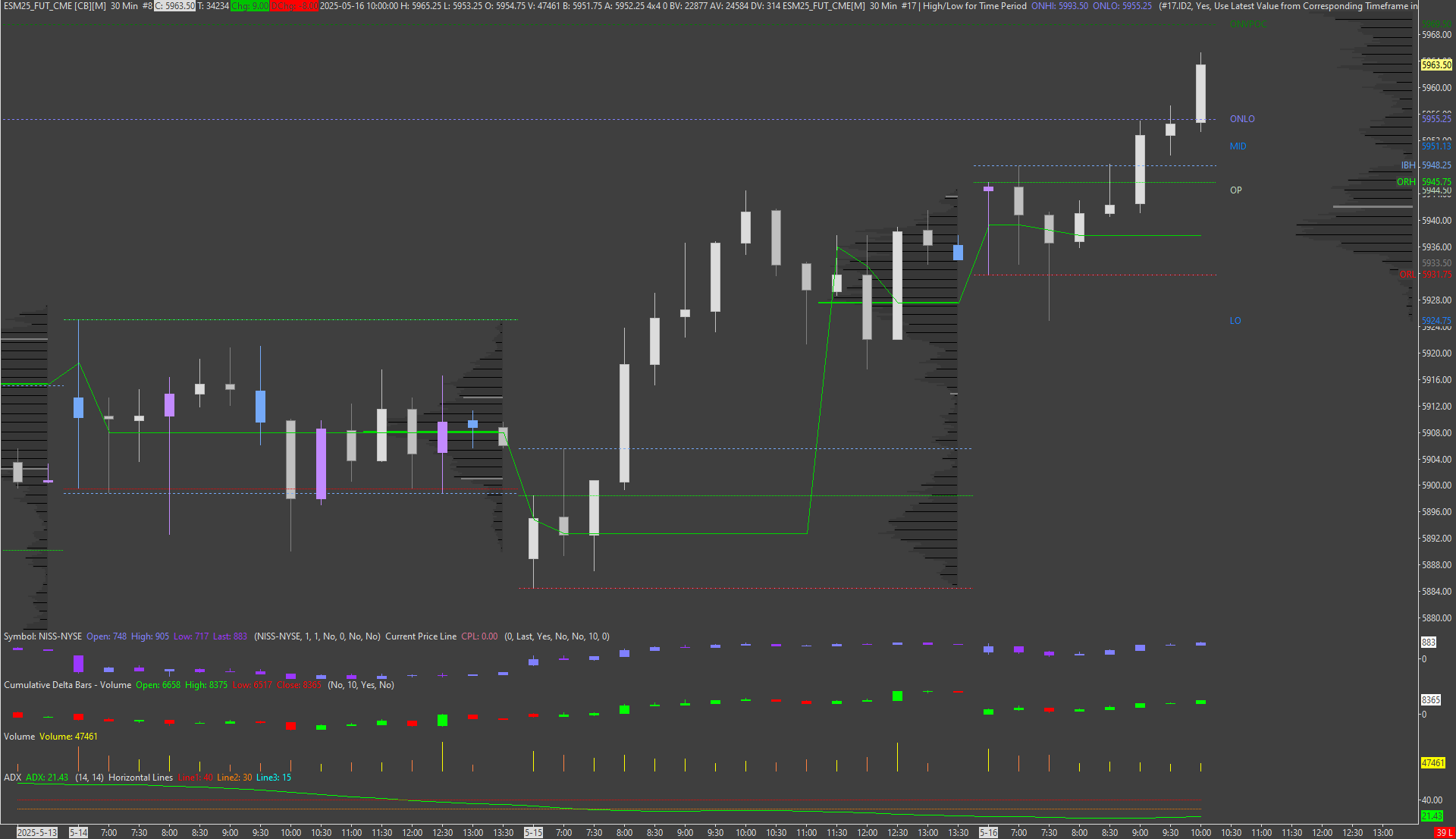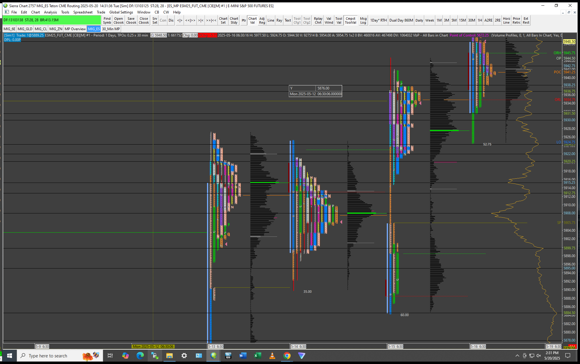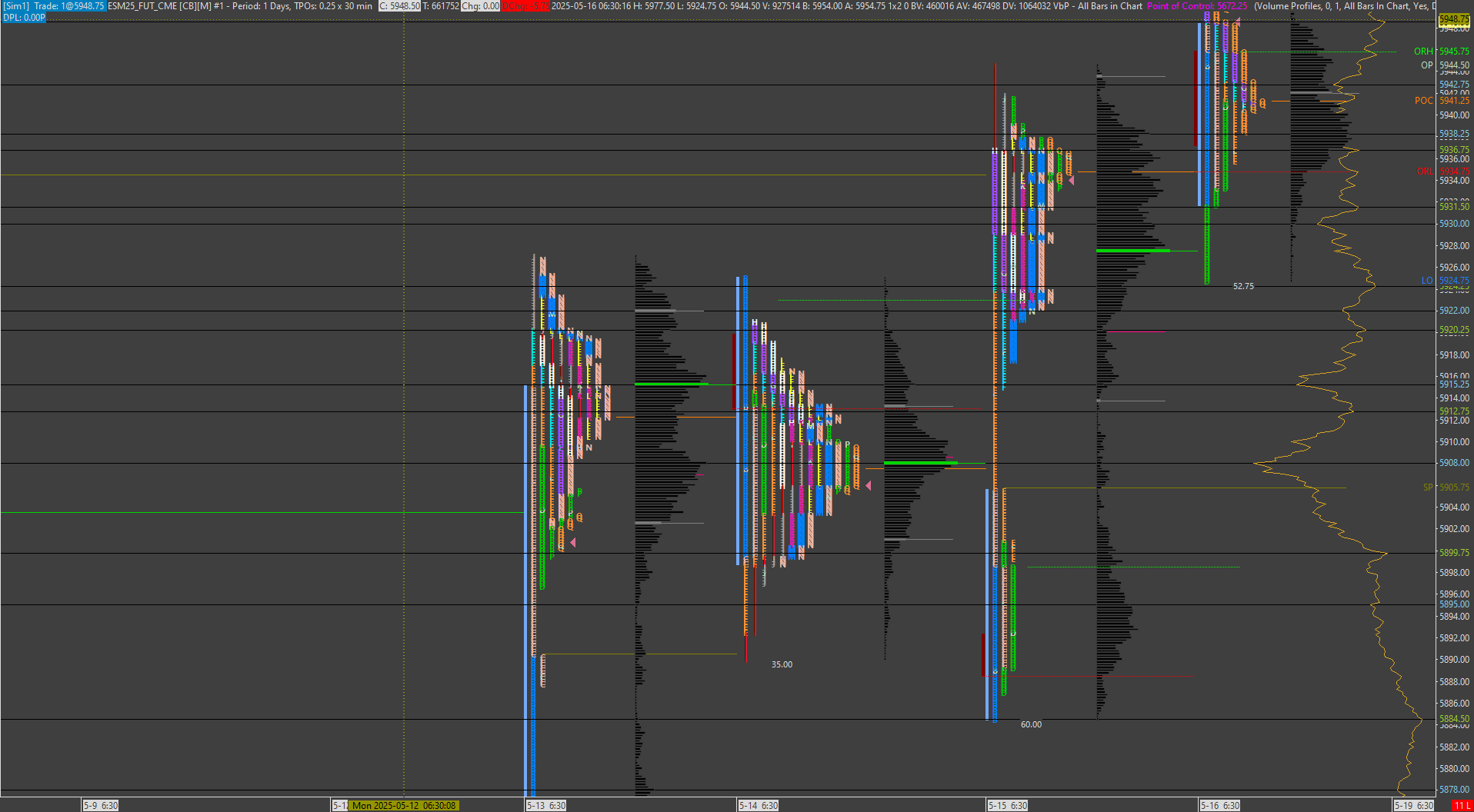 Then I think there is an issue. The Initial Balance/Opening Range High is higher than the Opening Range high on the TPO profile Chart on 5-14-25 and on 5-15-25. And the Initial Balance/Opening Range Low is lower than the Opening Range low on the TPO profile Chart on 5-16-25. NOTE the Initial Balance/Opening Range is set for 30 seconds and Opening Range on the TPO profile Chart is set for 1 minute. So it should be that if there was a discrepancy it would be reversed The longer the timeframe the potential for a high or lower opening range. Note: the OR for the Initial Balace/Opening range are the Red and Green dotted lines around the B lettering off to the right. And the OR for the TPO chart is the purplish colored bar to the left of the B letter. https://www.sierrachart.com/image.php?Image=17477773051.png https://www.sierrachart.com/image.php?Image=1747778470764.png Date Time Of Last Edit: 2025-05-20 22:02:02