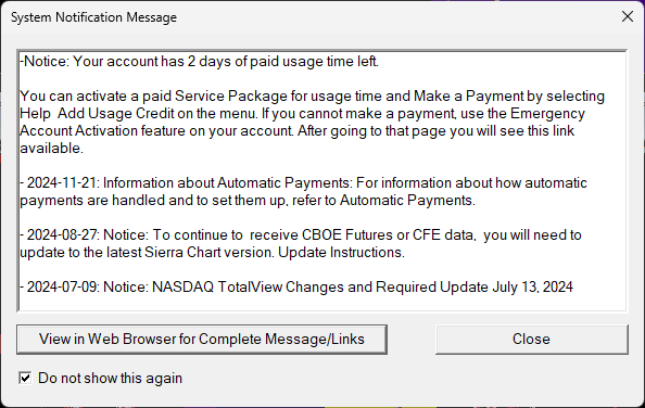 My balance is current for Sierra Chart to be rebilled in two days. The System Notification Message pops up every time I start Sierra Chart. See attached. This happens not just for re-billing Sierra Chart, but if I have CME data re-billing as well. No matter how many times I check the "Do not show this again" box, it keeps coming back up. Is there a way to disable these messages permanently? Thank you. Date Time Of Last Edit: 2025-05-23 02:28:46