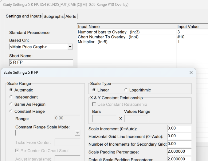 Hi, I'm using a 14 Range Numbers Bars chart and a 5 Range Numbers Bars chart. I would like to overlay the last 3 Numbers Bars from the 5 Range Numbers Bars onto the 14 Range Numbers Bars chart (in other words, lower chart onto the higher chart) The only study I can find it the study called: Overlay (Non-Sync) When the "Overlay (Non-Sync)" study is added to 14 Range Numbers Bars chart and in the setting the 5 Range Numbers Bars chart is selected under "Chart Number to Overlay" Then in the "Graph Draw Type", there is no Footprint to select from. (even if I select candlestick, it is not displayed) I attached to screen images to show the setting. If this study will not work, is there another study that can be used? Regards, |