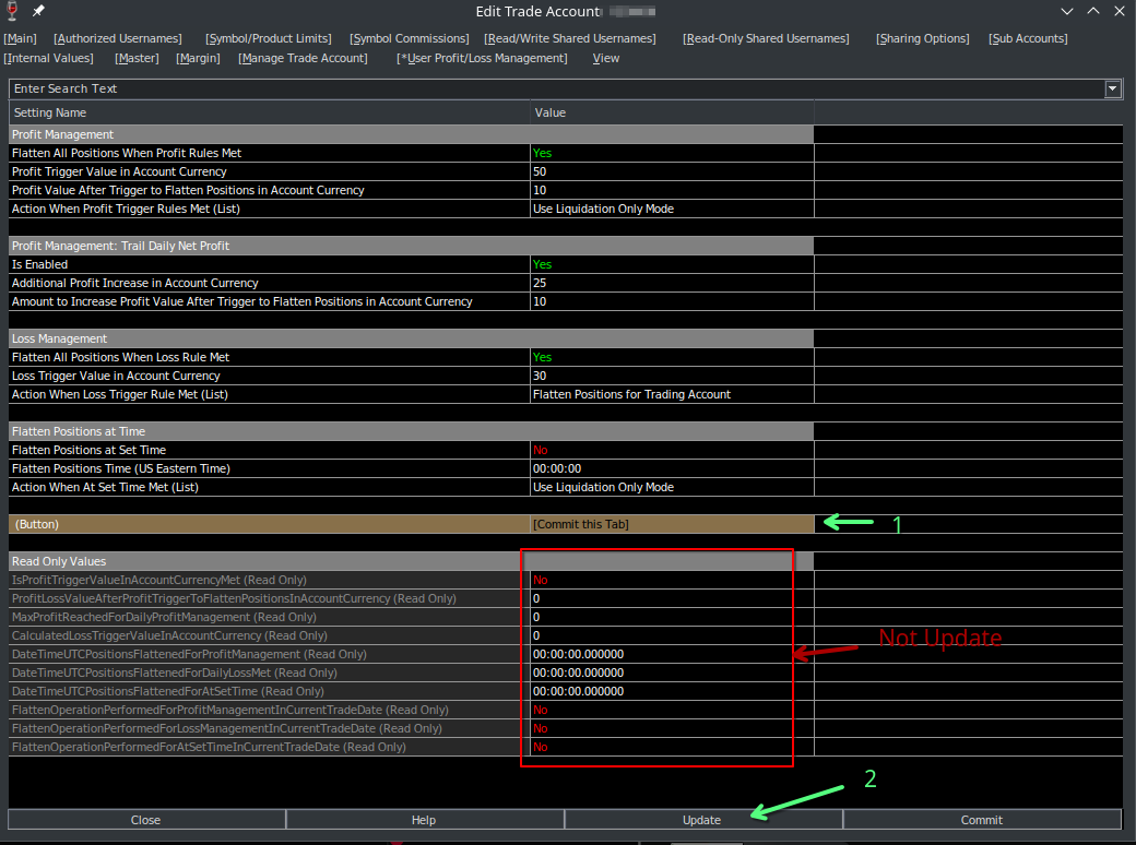 Hi, I watch this video of Sierra Chart User Profit/loss management https://www.youtube.com/watch?v=iAAmJqltGSg I follow the steps to set parameters and then "Commit" and "Update", but there is no update of any parameter at lower part of window, as the video shows The steps i folow: - Set the profit and Loss values and flatten or liquidation mode - Click on "Commit this tab" - Click on "Update" button Result: Not update parameters * If the attached image couldn't see, i've upload it to Imgur https://imgur.com/BkQ02ve |