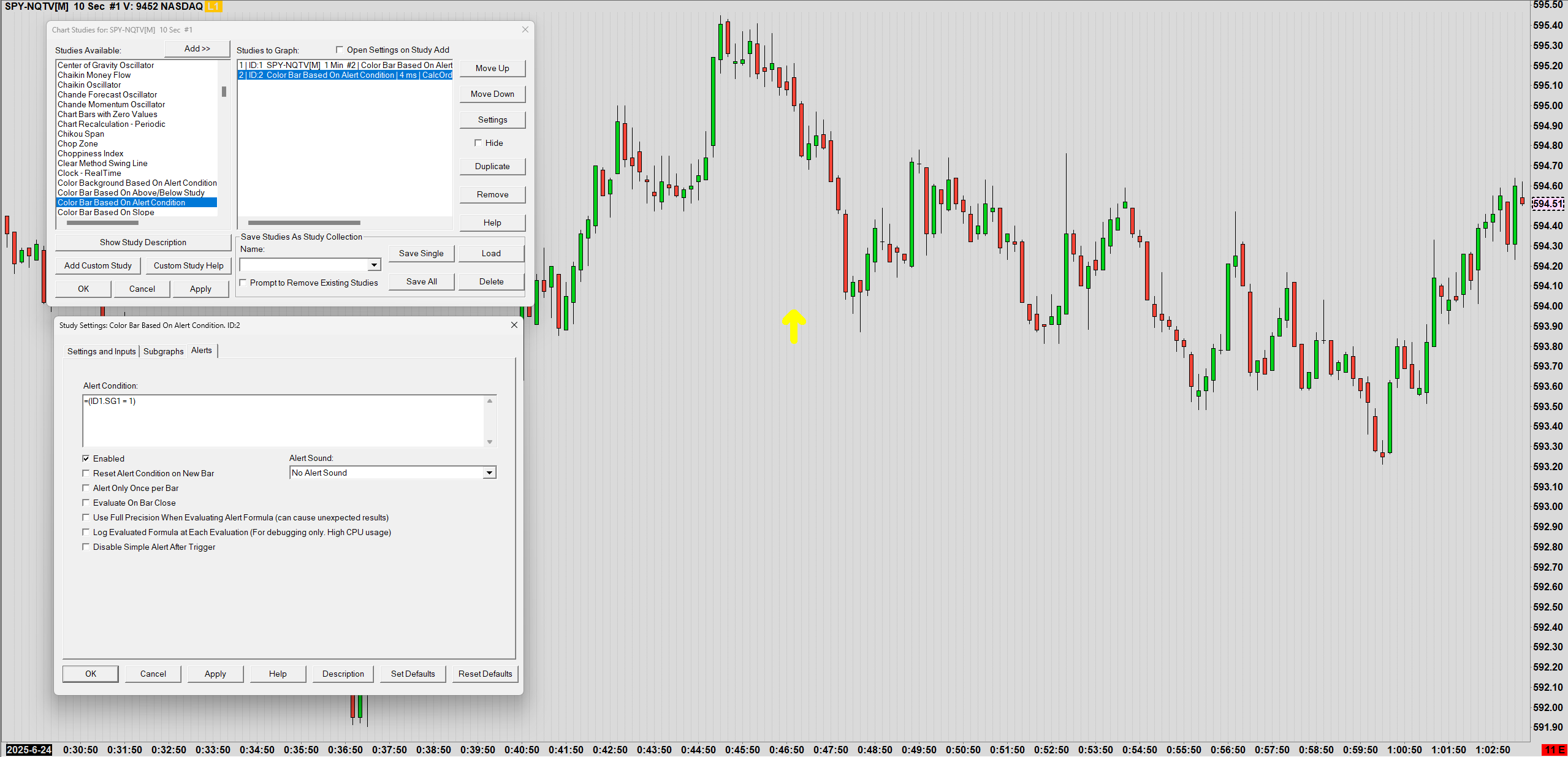 Apologies if my wording is confusing, but I'm finding it difficult to wrap my head around this. I have 2 charts open, both using different bar periods (chart #1 and chart #2) With chart #2, I'm using Color Bar Based On Alert Condition (ID1.SG1). I have "Output When Condition True" set to Study Subgraph Reference. I am referencing a Moving Average (ID2.SG1) set to "hidden" on that same chart, so that whenever the alert condition is true, the alert paints an arrow on the chart where the moving average currently is. On chart #1, I'm using "Study/Price Overlay" (ID1.SG1) to overlay the arrows from chart #2. However, I would like to change the positioning of the arrows. Perhaps put them above the candles, or even have them attached to a different length moving average etc. How would I go about doing this? I tried adding a Color Bar Based On Alert Condition to chart #1, and setting the formula to: =(ID1.SG1 = 1), but that didn't work. |