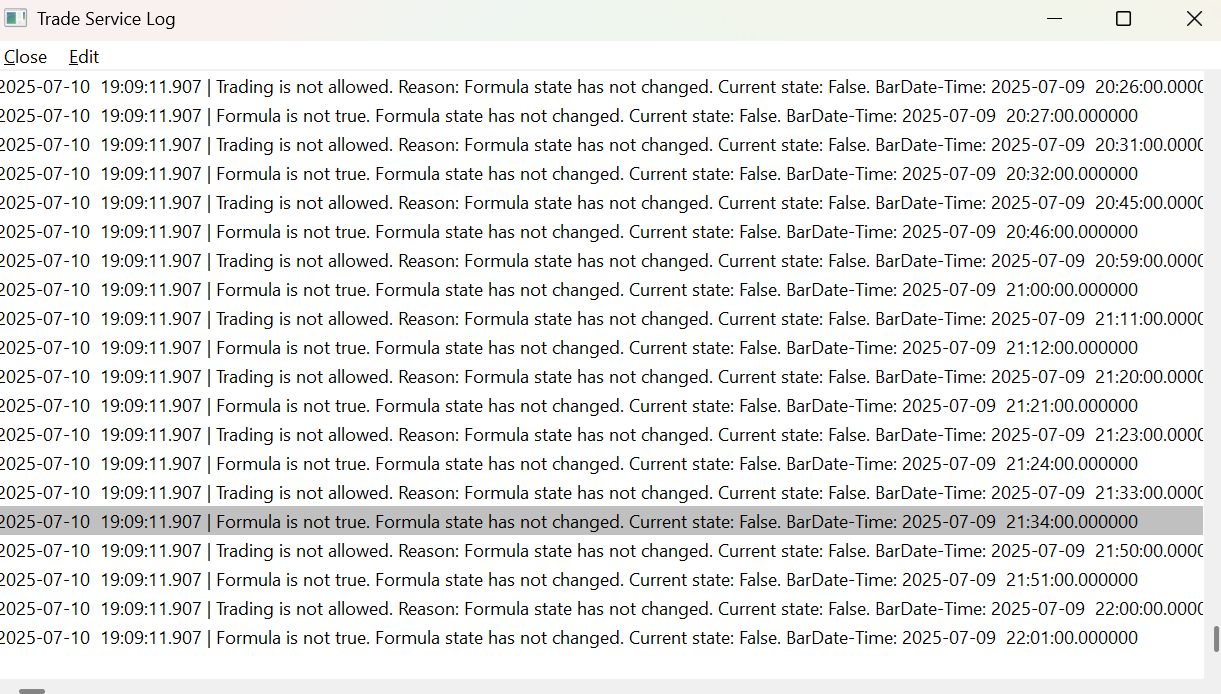 Dear Sierra Chart Support, I’m currently experiencing an issue with automated trading using Trading System Based on Alert Condition study. While my alert formulas are triggering correctly and showing up in the Alerts Log, no trades are being placed. The Trade Service Log consistently reports the following error: “Trading is not allowed. Reason: Formula state has not changed. Current state: False.” I have double-checked the following settings: Automated trading is enabled both globally and for the chart. The alert formulas trigger correctly and are visible in the Alert Manager. Manual trading works without any issues. Order Quantity and Symbol are valid. Study settings allow order placement. Despite this, no trades are executed when the entry condition becomes true. To assist you in reproducing and diagnosing the issue, I’ve attached the chartbook I’m currently using. Could you please test the setup and advise what might be causing this issue? Thank you for your assistance. Best regards, Ramkumar |