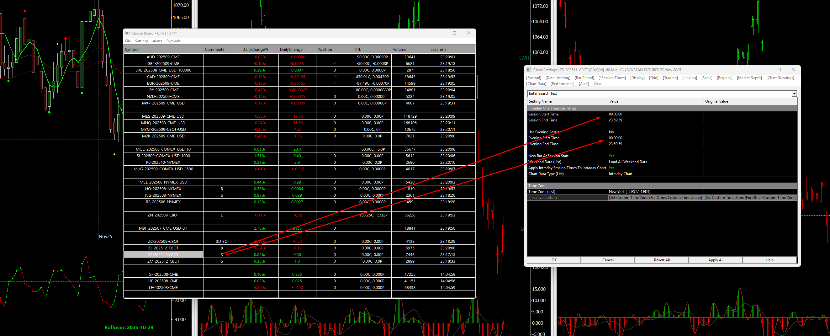 Hello, I’m experiencing an issue with the ZS (Soybean Futures) symbol. When switching to ZS from the Quote Board, the chart consistently loads incorrect intraday session times — defaulting to 00:00–23:59:59 — even though I’ve configured the chart to use the Evening Session setting. This doesn't occur with other symbols; most load correct session times automatically. I suspect the problem may be related to how Sierra Chart handles Global Symbol Settings or overrides during Quote Board symbol switching. Could you please clarify what might be causing this issue and how to ensure the ZS chart respects the correct CBOT trading hours when selected from the Quote Board? Thanks in advance, Date Time Of Last Edit: 2025-07-11 17:09:58