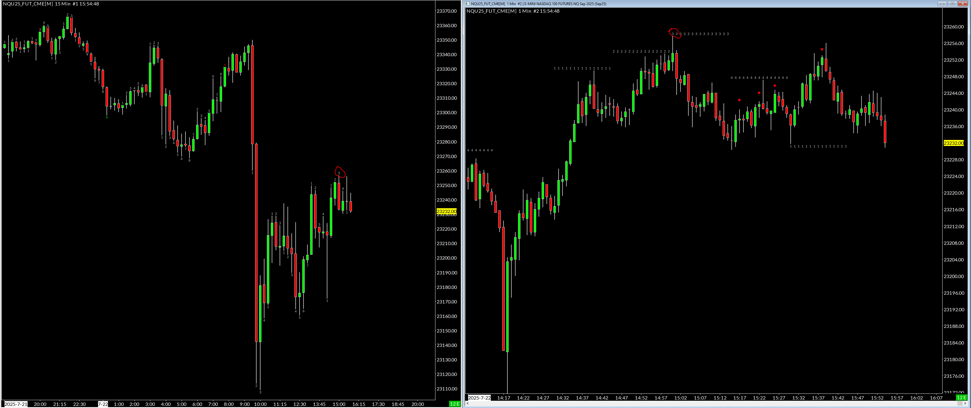 Hi, Yes I realize a number hasn't printed because the bar has NOT closed yet however my request is the option of displaying the PREVIOUS number until the close where it would update. That way if I want to short after the 15m time frame has a 3+ sell count and 1m bar shows two UP closes in a row I can do it. See attached picture 15m bar has a 3 sell count on 15:00 approx so on 1 min chart I manually plotted a sell signal on every two closes in a row up. The Trading the Nines is a fantastic tool to let traders know when trends are likely to slow and often reverse making even a simple 2 bar signal a fairly high probability signal! But like I said it can't work now. I just want on the current bar to see the previous bar's count so when I add it to other time frame its there and trading signals can easily be made using longer time frame movements. I realize the sell signal at 15:42 would disappear after because that 15m bar forms a 1 buy signal at the close but before the close would still be displaying a 4 sell count as that was previous 15 min bar's count. I'm ok with that limitation mainly want to find real time trades and realize SOME signals will disappear after the longer time frame bar closes. I could care less about this limitation. |