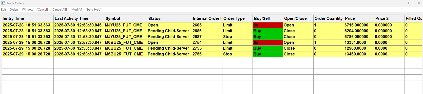 Support, I seem to be having difficulties getting my orders filled on two attempts. I am using Teton order routing. I placed an order yesterday, price moved through the order and no fill. I was a bit perplexed by this when I checked my orders at the end of the day. I cancelled that order and placed another order yesterday evening and again no fill when price moved through my order. This is a limit order type with attached orders but to have no fills on two attempts seems like I am doing something wrong. Can you help me troubleshoot this issue? https://www.sierrachart.com/image.php?Image=1753895848921.png |