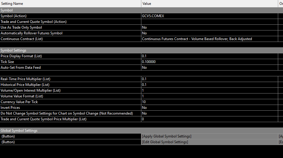 I've updated and tried to update symbol settings again aswell. Below is a screenshot: https://www.sierrachart.com/image.php?Image=1754440764700.png The current price is different from where the price line is and at the top youll notice the TR is going into negative. Should be noted that the chart functions fine when the continuous contract setting is set to none. I currently have it set to volume based rollover, back adjusted Cheers |