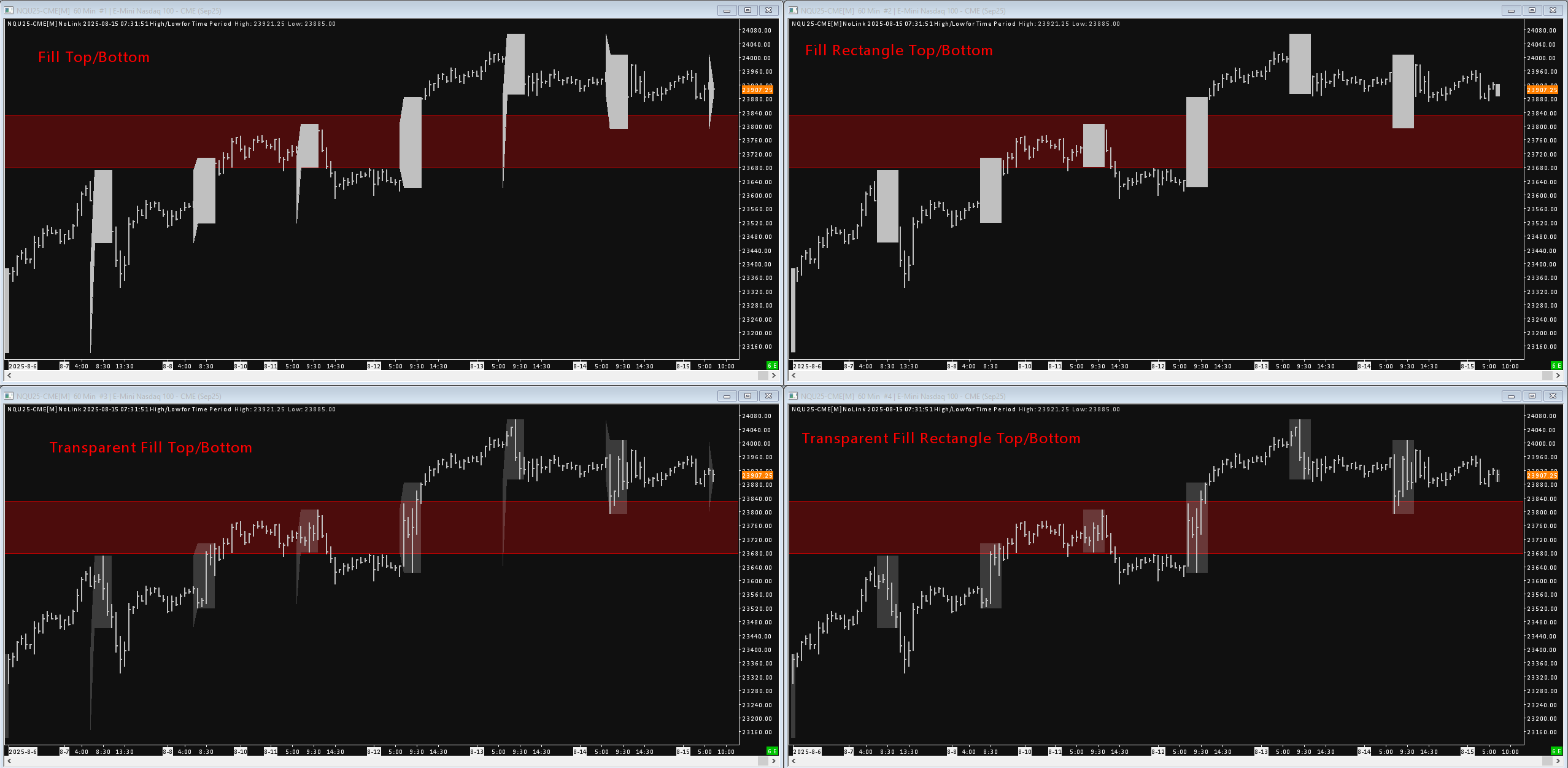 Unfortunately although that's the draw-type I want it's also the one that causes the issue. So what is the issue? You tried fill top/bottom and got strange artifacts on chart = no good You tried transparent fill top/bottom and got strange artifacts on chart = no good You tried fill rectangle top/bottom and got the desired outcome (no artifacts), except instead it blocked drawings = no good What's the the problem with transparent fill rectangle top/bottom, it neither blocks the drawings nor does it have strange artifacts on the chart. Did I miss something? Date Time Of Last Edit: 2025-08-15 12:54:05