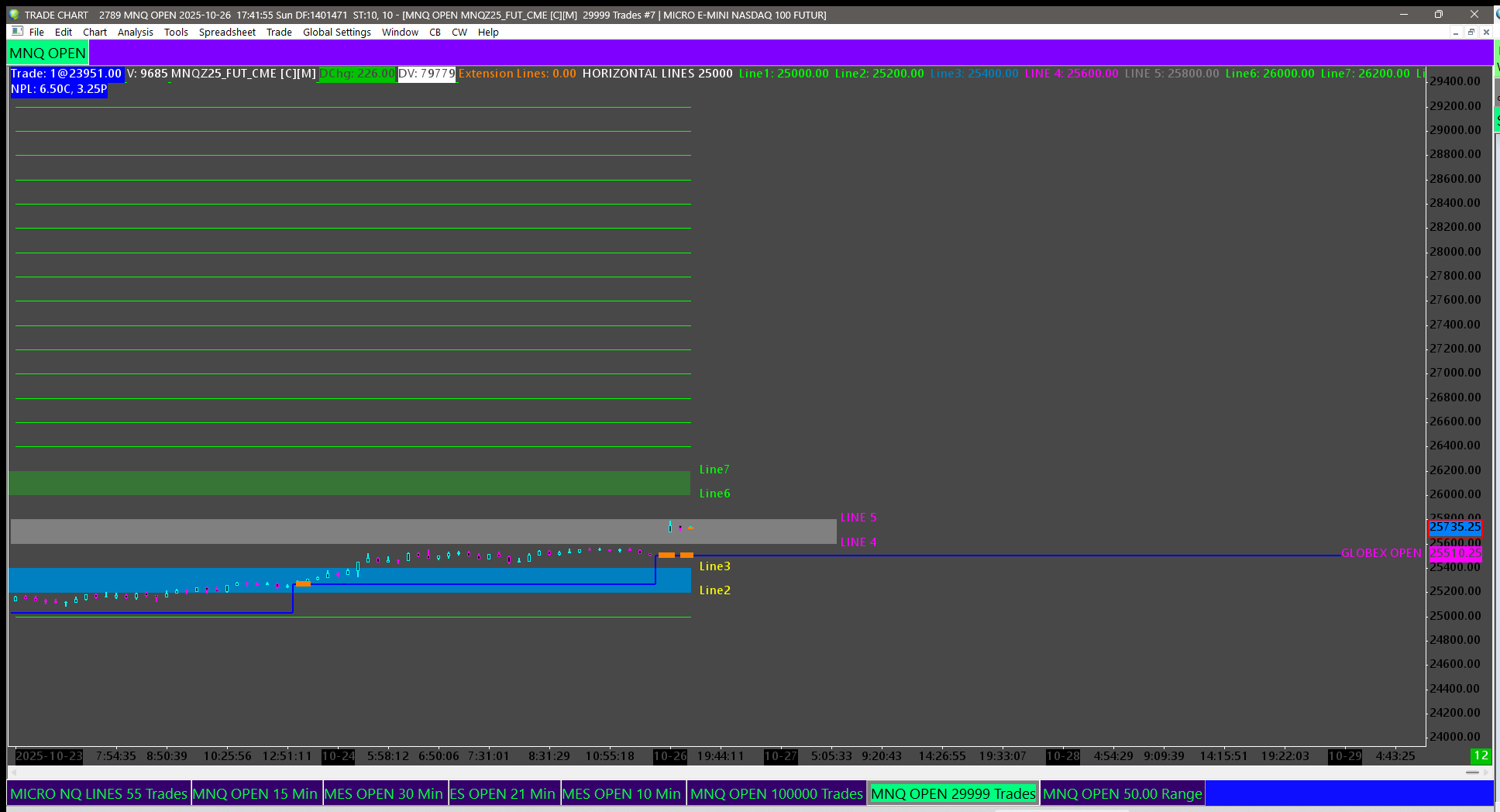 Would it be possible in the distant future to have the Horizontal Lines study be able to anchor to an another study for the starting reference point scale. For example to have it anchor to the RTH open or globex open? And, have the mid point of the 40 lines be set to that so half of the lines would be above/below the anchor scale point? Using something similar with a lot of (+10) study sub graph add lines combined with 10+ study sub graph subtract lines. At different distances.. +100 +225 + 300 ticks. All based off a 10 am horizontal line for the starting price scale amount. The current study locks in the same scale increments and you have to key in the starting reference price number for example 25000 to make use of it and then re key a new level for a change, rather than having it based on another study. A time line or the open high low for time period. If half of the 40 lines could be below that point and half above it would be more useful. Thanks Thanks Date Time Of Last Edit: 2025-10-27 00:43:52
