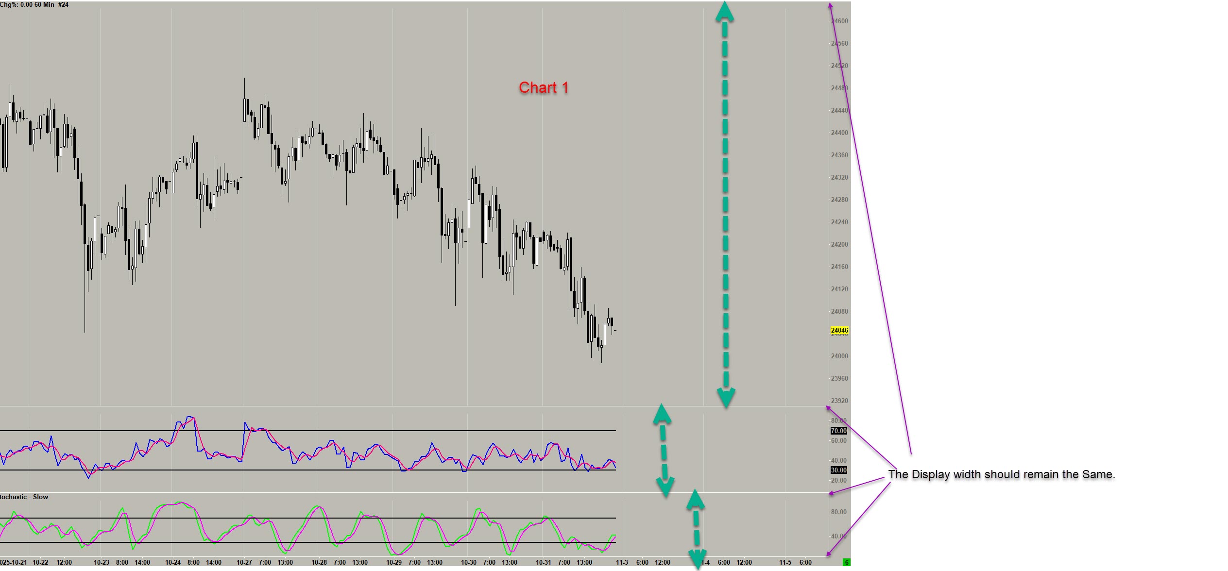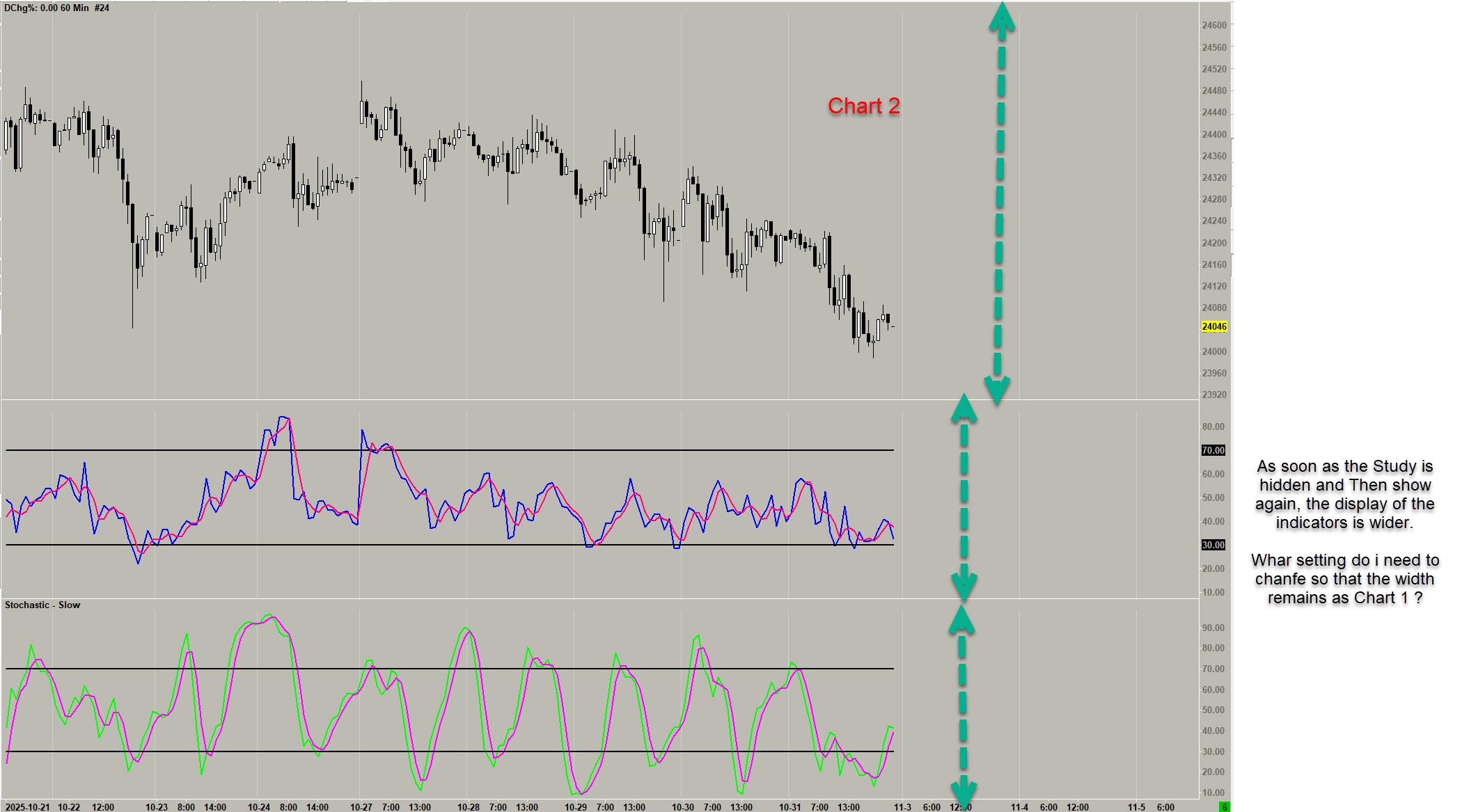 Hello I am experiencing the following issue with the study display in the chart. When I display the study, I set the view width as in Chart 1. The data feed must be activated. As soon as I hide the study and then show it again later, the view width is no longer set as in Chart 1. I have checked all the settings in the scale settings, but SC does not save them. Please compare Chart 1 (this is how the settings should remain) and Chart 2. What is the problem here? Because every time the study with indicators (e.g., RSI, Stochastic) is hidden and then shown again, it has to be readjusted. Thank you very much for your help. The display width should remain the same! The display width should remain the same. As soon as the study is hidden and then shown again, the display of the indicators is wider and the candlestick chart is smaller. What setting do I need to change so that the width remains as in Chart 1 |