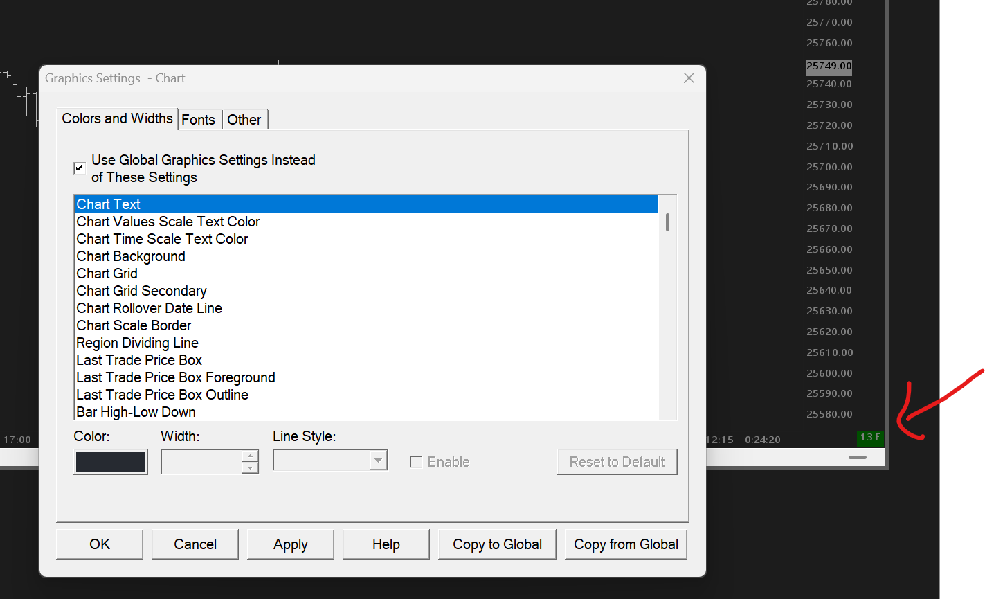 Hi Sierra Chart Engineering, Not a blocker, and a refresh or close/open chart fixes it, but the end of chart marker will use its own column (or the price scale is drawn left of the end of chart marker's width) when switching from using Chart Graphics and then switching to using Global Graphics settings. See attached image. Also attached a simple chartbook with the repro. Unsure when this issue appeared and only noticed it in v2846. |