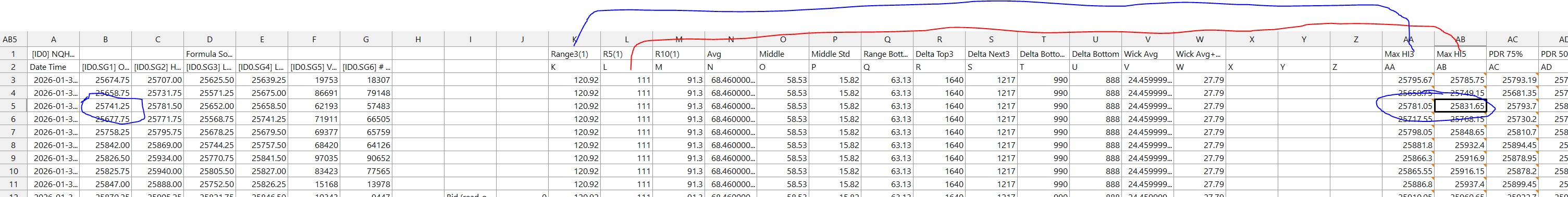 Hi, I'm creating stats on how far various bars move here is a 60m bar. I put those stat values in column K to W and use those to plot the levels on chart. I noticed when I scrolled back on chart the values are totally wrong! Column K is BIGGER than Column L so when I add those values to Column B the bar's open the result in AA should always be bigger than column AB. It's not! K@3 = 120.92 L@3 = 111 Notice AA@3 is correct and is bigger than AB@3 like it should. Every row below SHOULD have a larger value in column AA than AB but somehow columns after the first are all wrong. Column AA should be B@3+K@3 and Column AB is B@3+L@3. Wrong value show up in every cell I'm looking at. |