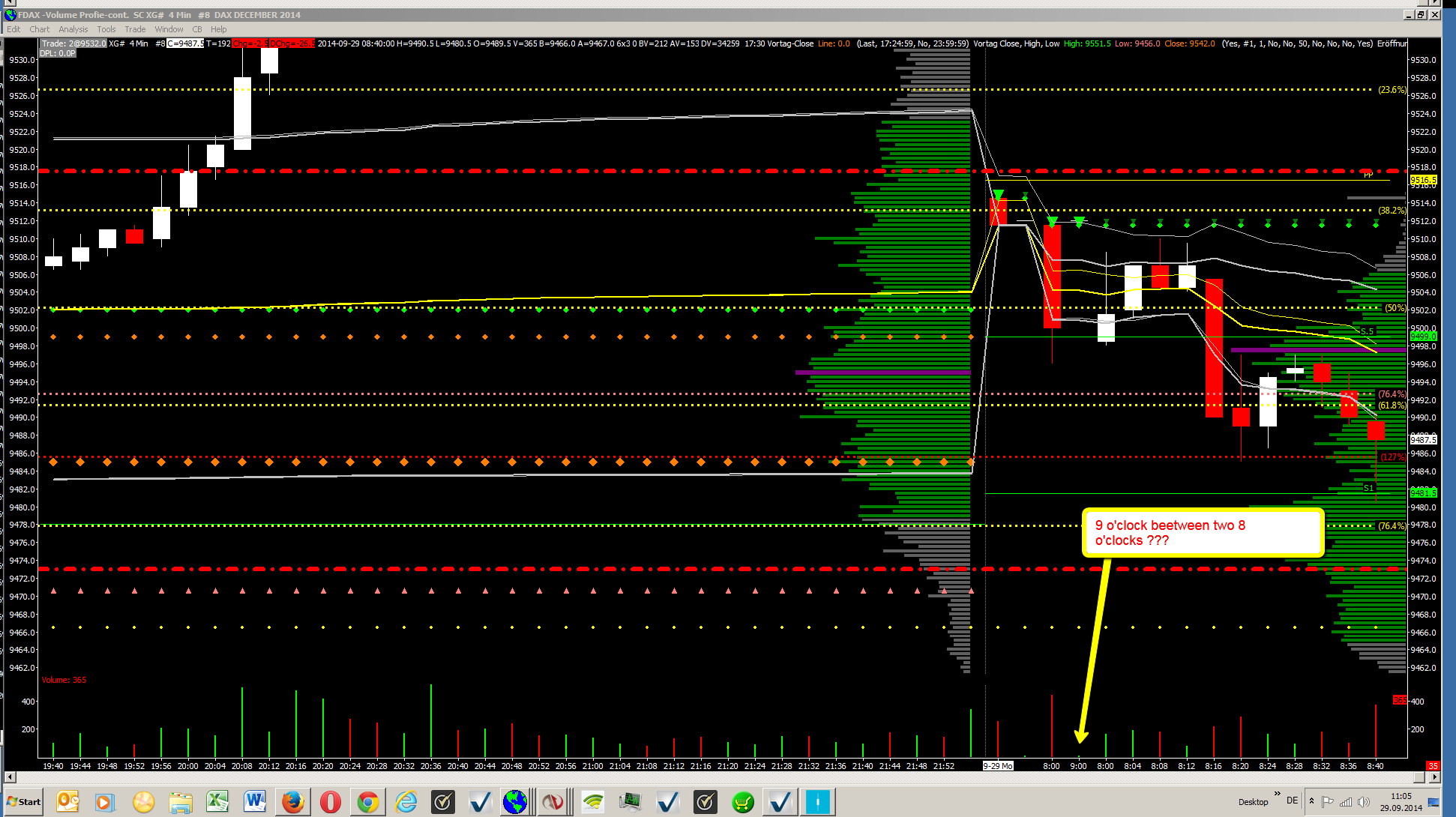 For the fdax my timescale is confused. As you can see (yellow arrow in the picture) today I have a 9 o'clock between two 8 o'clock at the time scale (x-axis). here you can also see the chart with German time: http://screencast.com/t/YJYnbp59XO8 All former days including monday from the weeks ago are ok and don't have this disorder in the timescale. I use the Iqfeed datafeed but another coleague which uses exact the same software has'nt this problem today. Date Time Of Last Edit: 2014-09-29 10:28:40