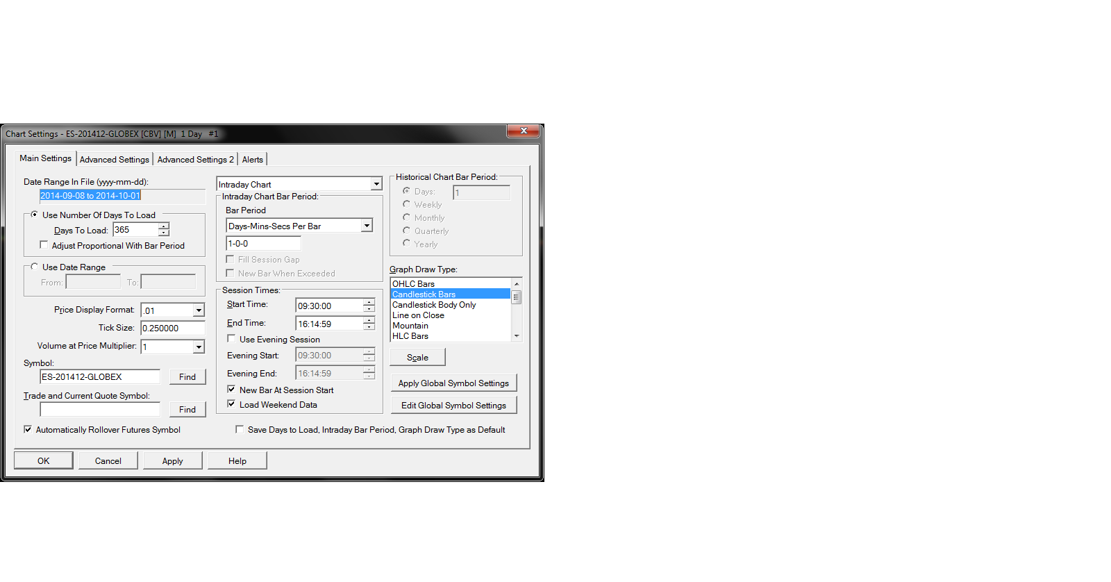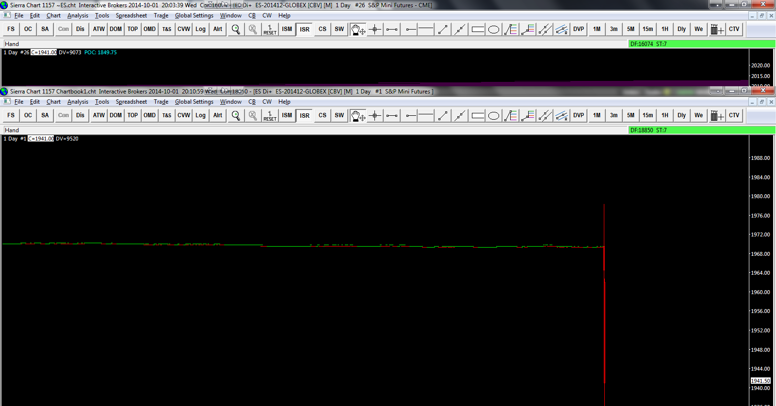 Dear Sierra, I'm using your data feed. One of my charts went wrong. It should be plotting 365 days of intraday data with 1 bar per day (continuous contract, backadjusted). Instead it is now only loading data since Sep8 (less than 30 days), and it is only plotting Oct1, before then it simply shows a straight line and 9:30am repeatedly (instead of prior days). Chart / Reload and Recalculate, and Data/Delete all Data and Download are not fixing the issue. I am attaching a screenshot of the chart and chart settings, as well as a chartbook containing the chart with the problem. I would appreciate your help. Thank you |